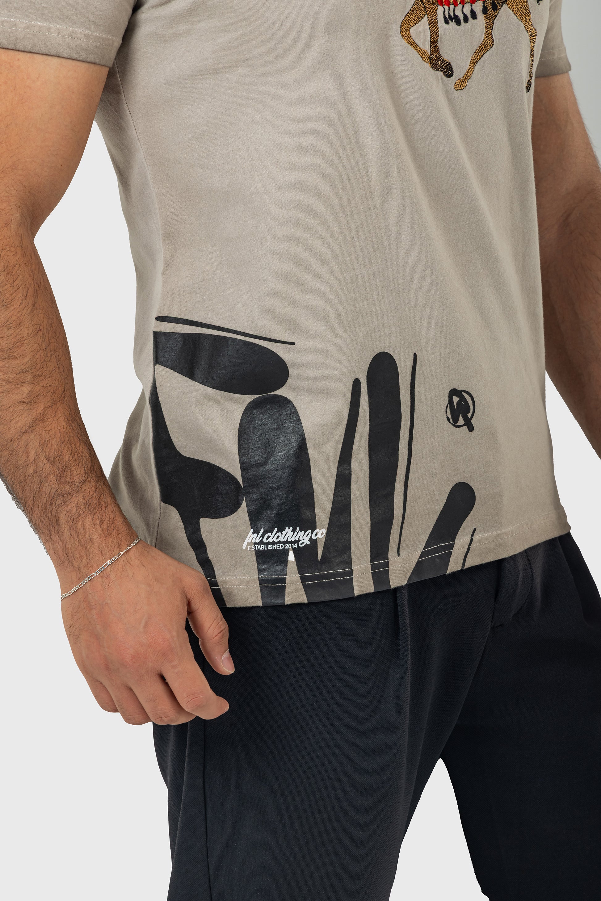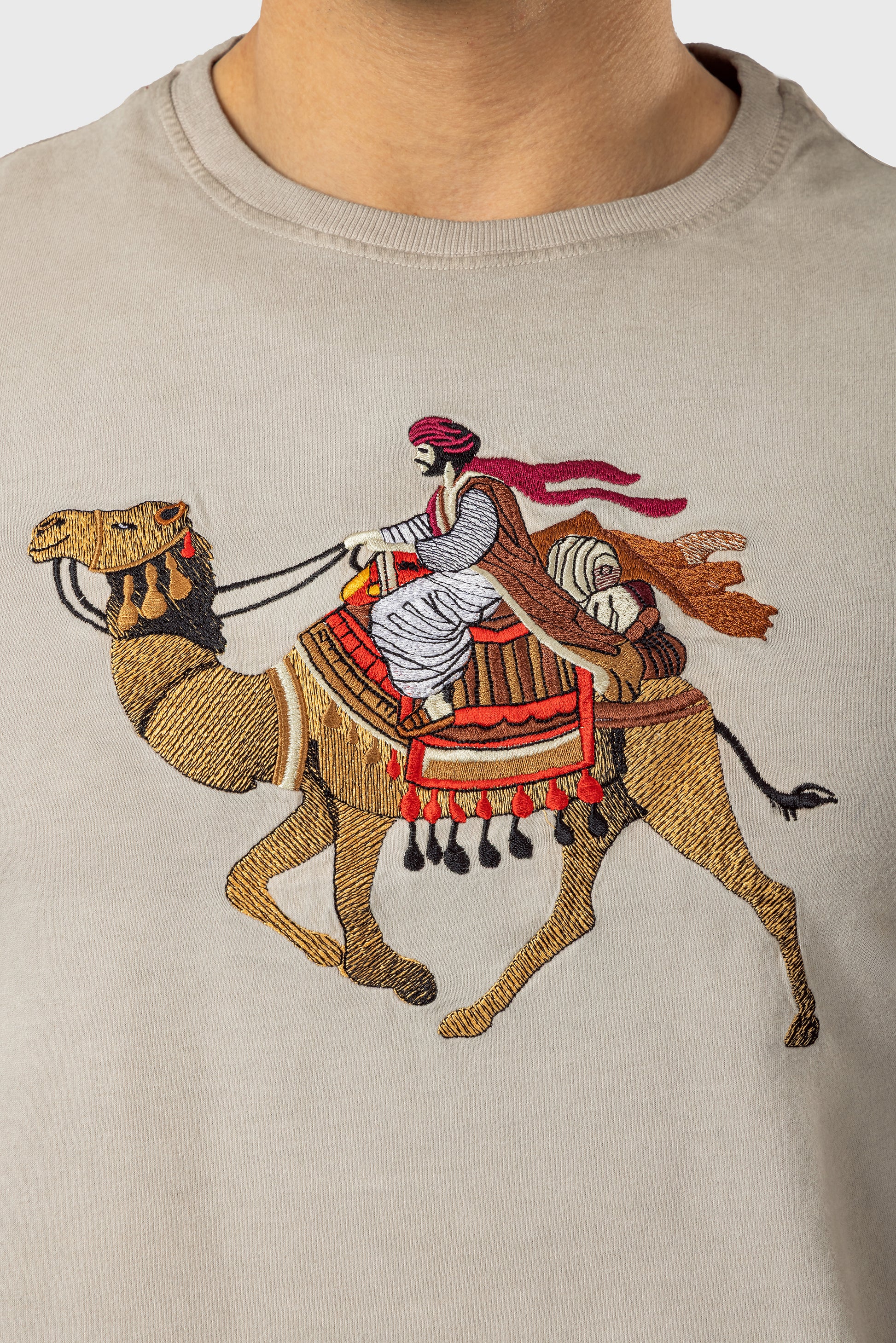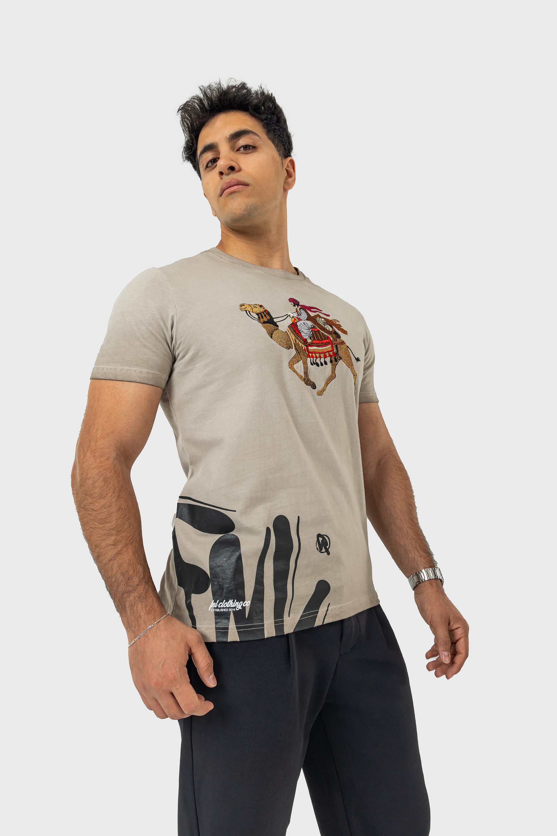 This T-shirt captures the essence of tradition with a modern twist, featuring an intricately embroidered camel and rider, vividly brought to life against a soft grey backdrop. The design merges classic cultural imagery with contemporary fashion, highlighted by a bold red FNL logo at the hem.