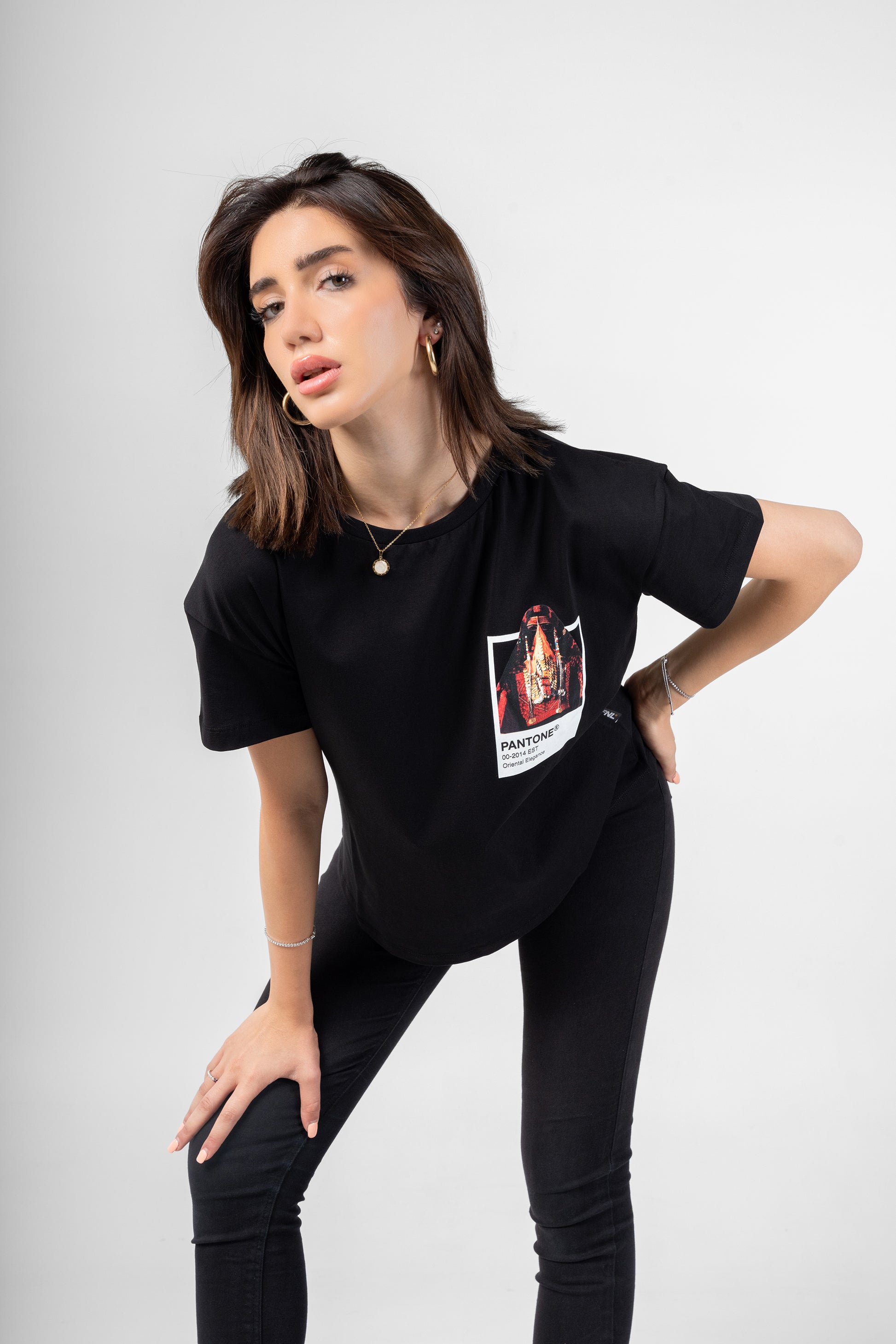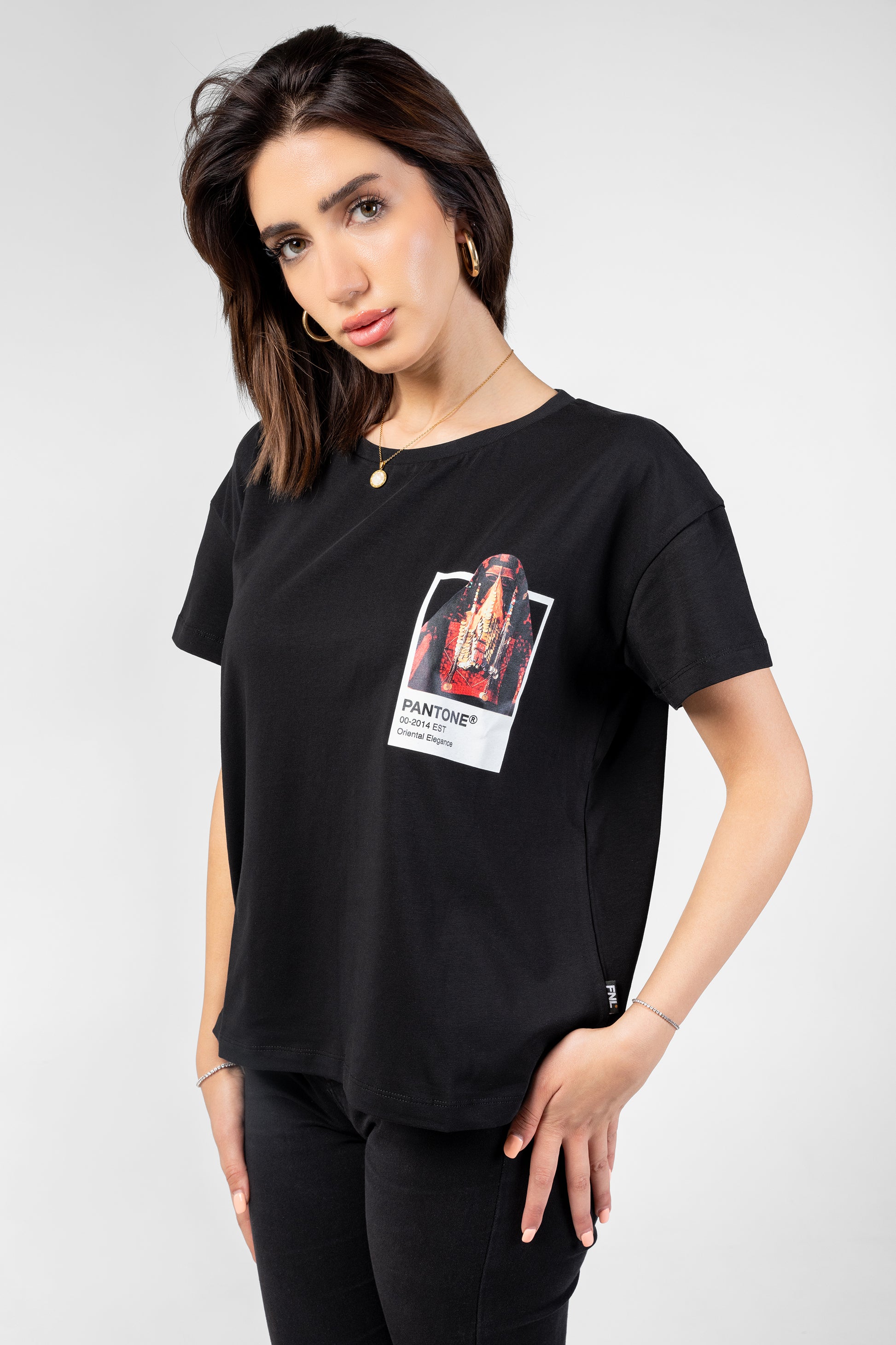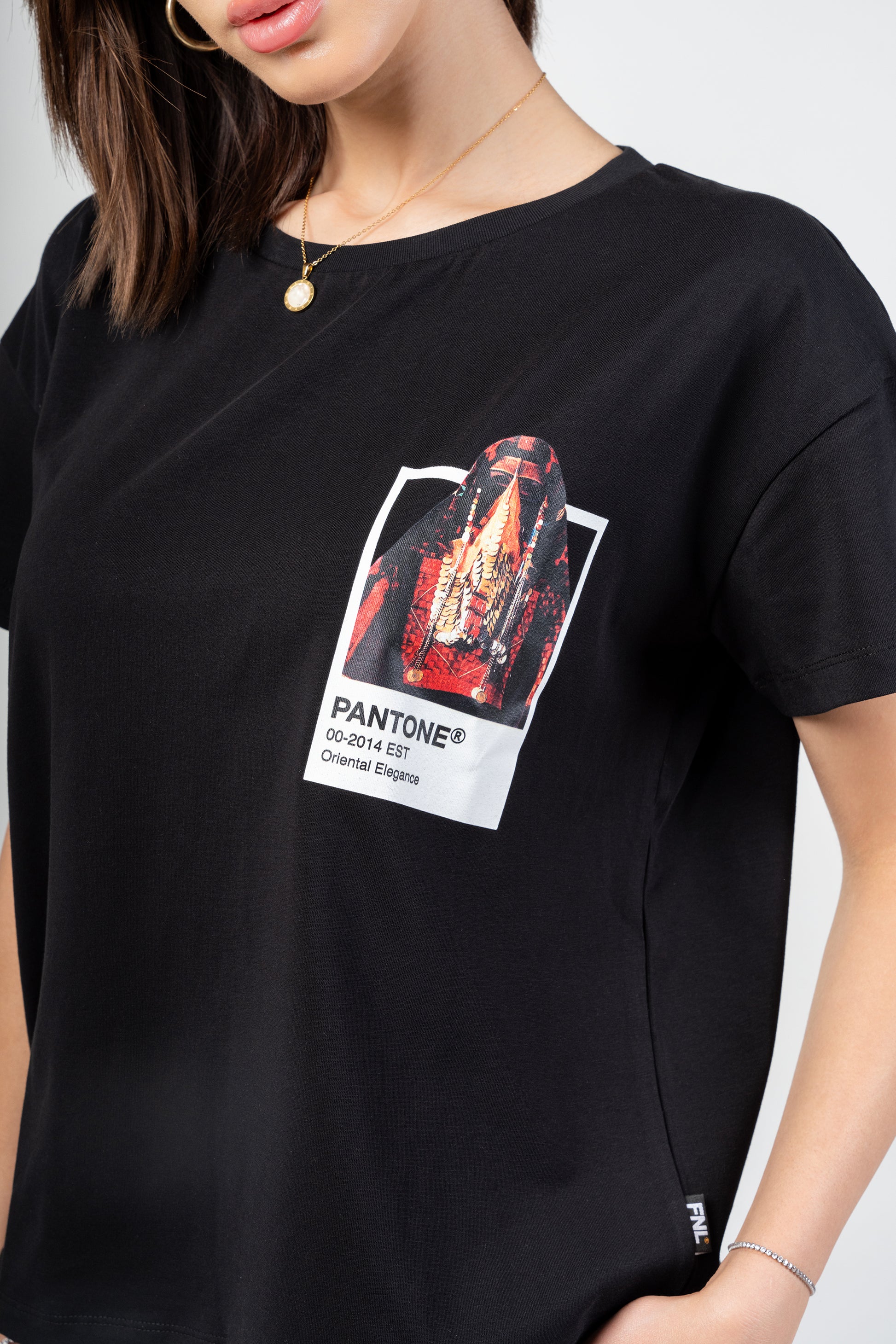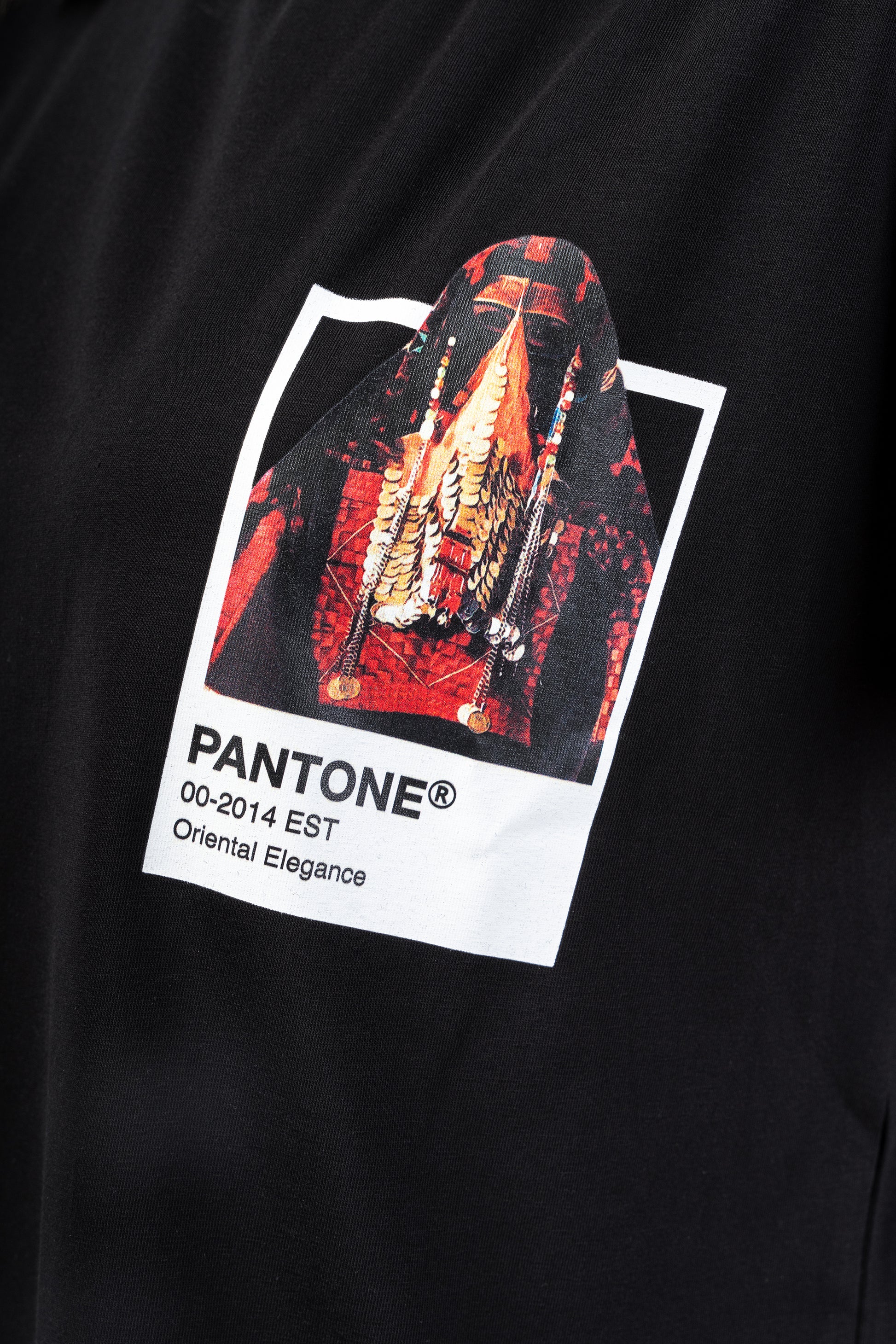 تظهر القميص بطاقة بانتون تحتوي على امرأة بدوية ترتدي الزي التقليدي البدوي الكامل.