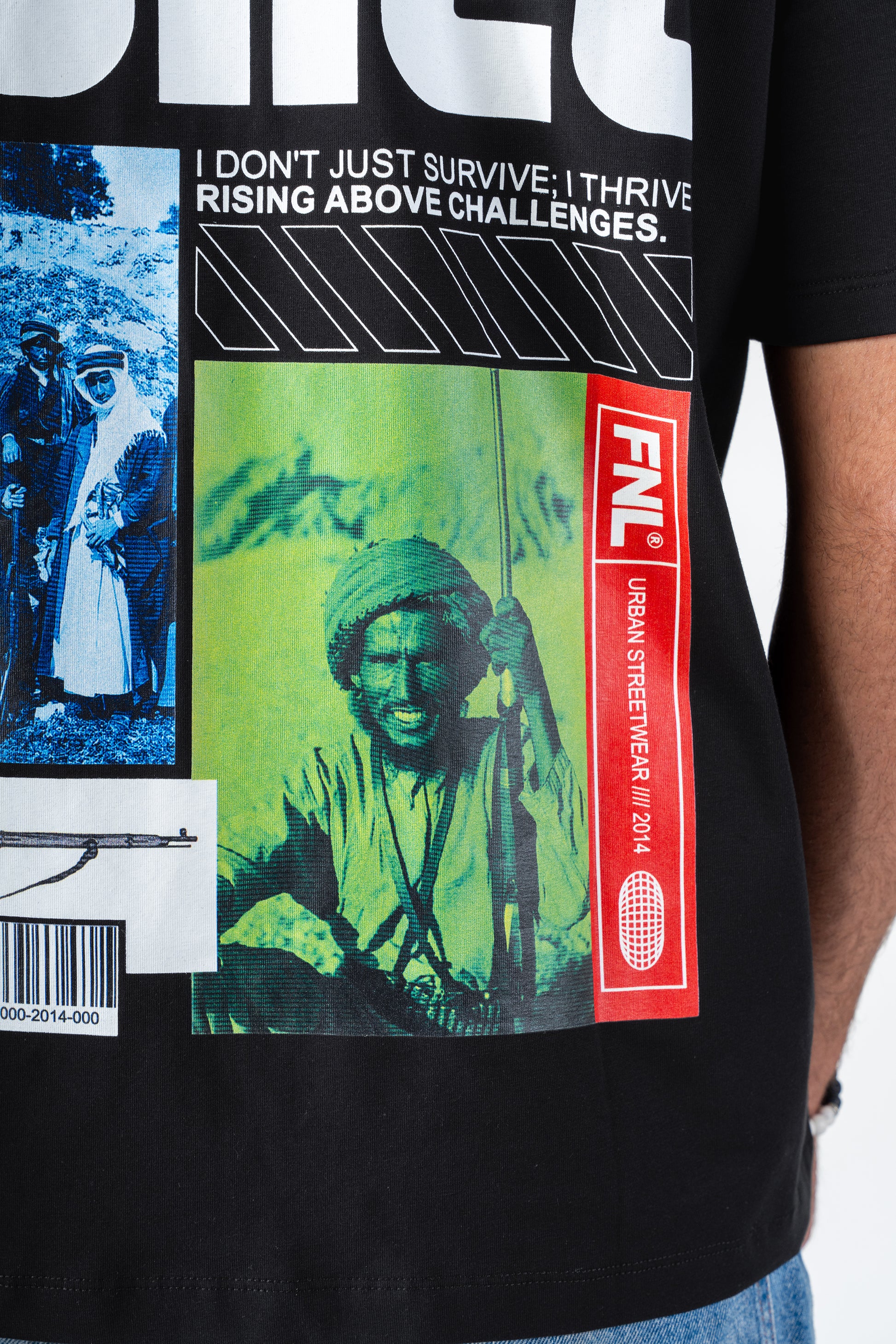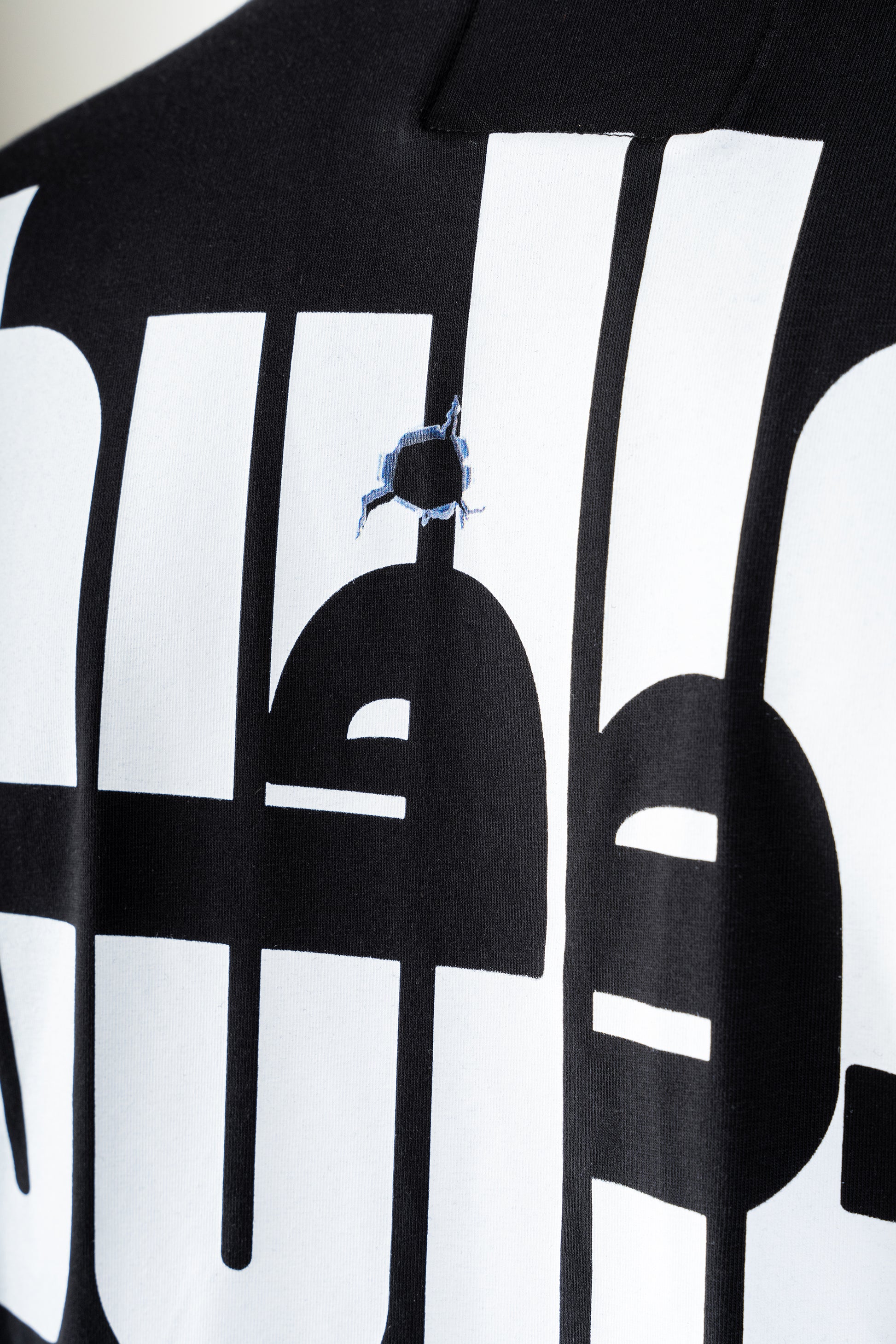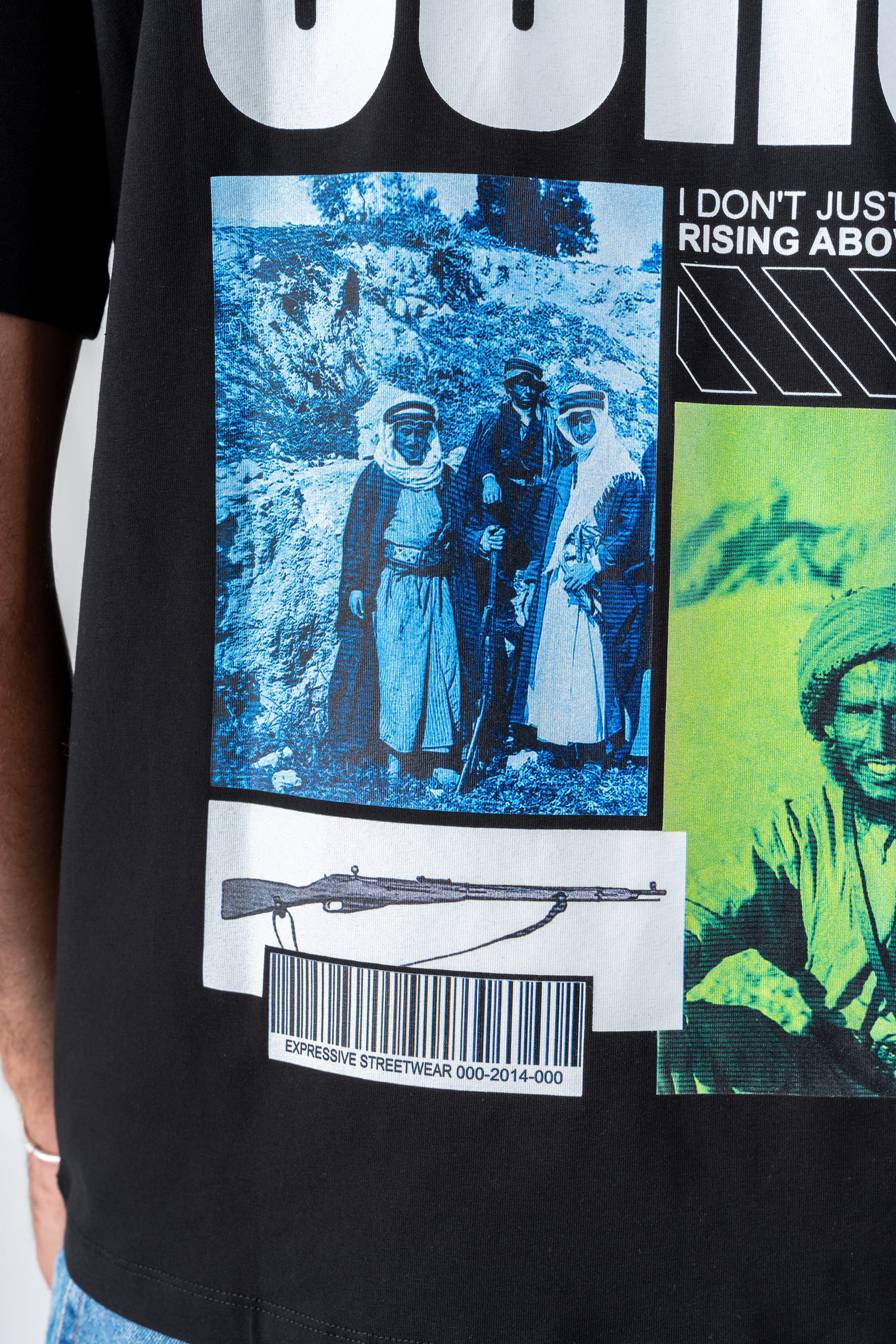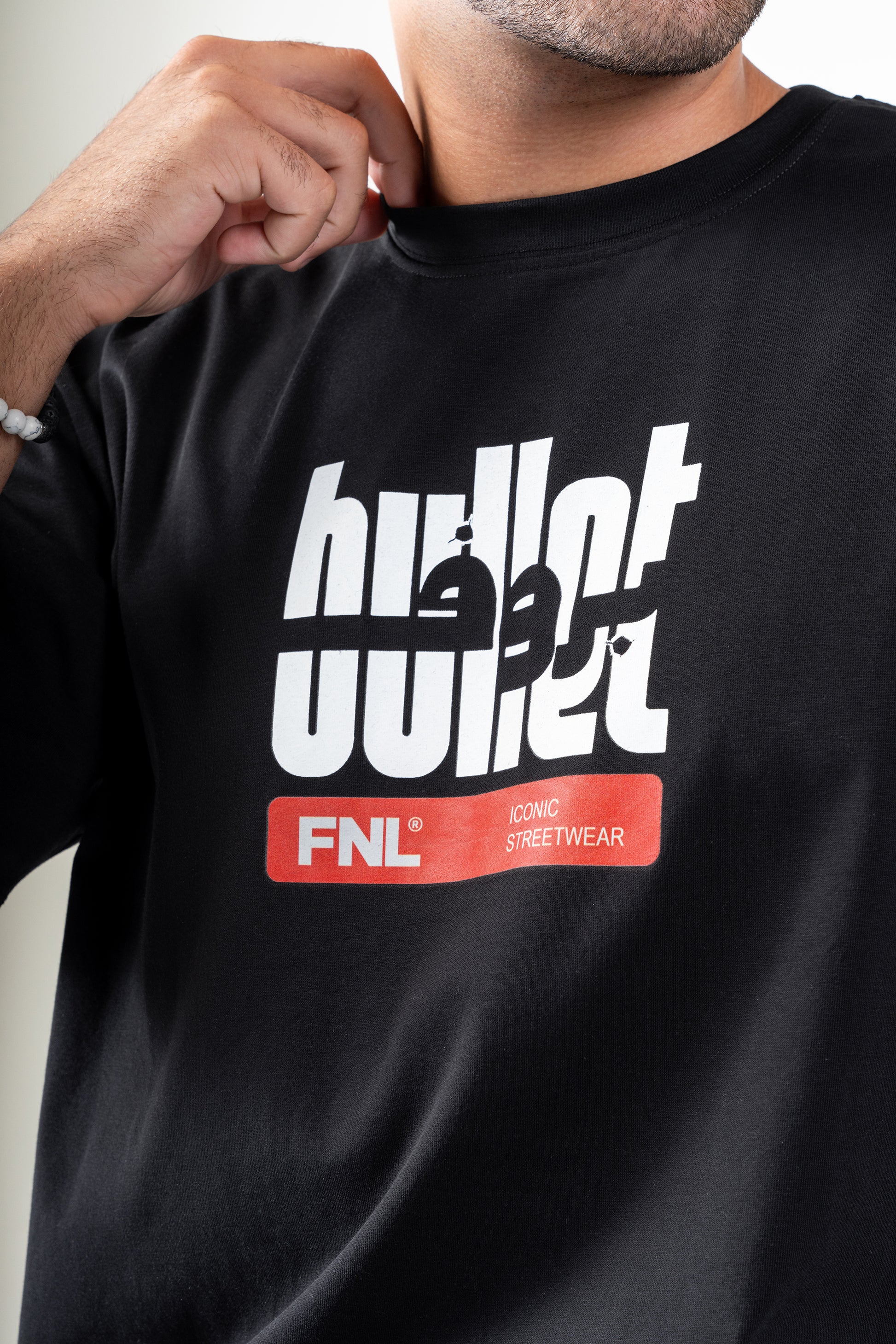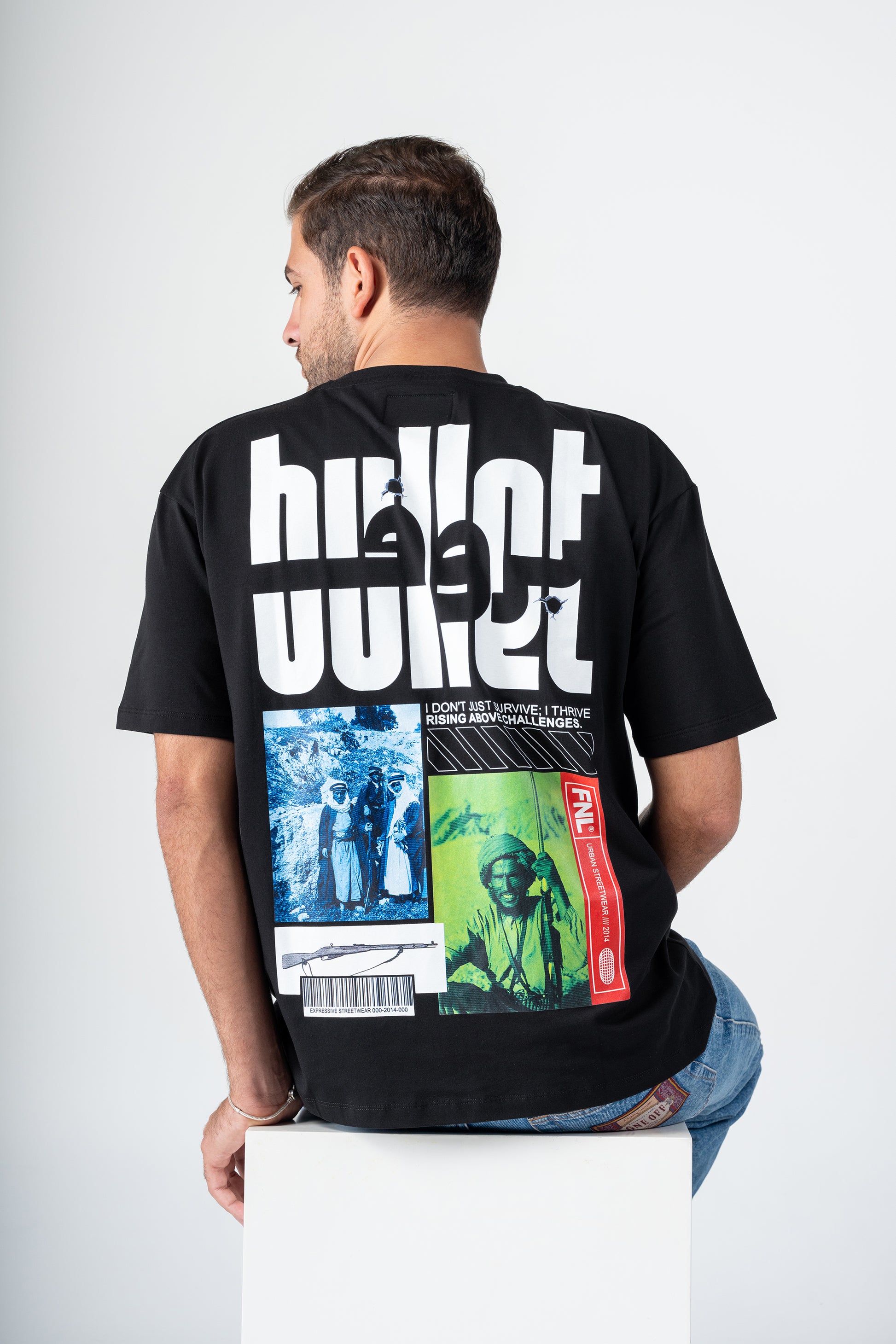 في منطقة الصدر، تُعرض كلمة "Bullet" باللغة الإنجليزية، بينما "Proof" باللغة العربية، معًا تشكلان مصطلح "bullet proof". ومن الجدير بالذكر أن النقاط داخل "proof" تم استبدالها بفتحات رصاص. على الجانب الخلفي، يتميز التصميم بصور لرجال بدو يحملون أسلحتهم التقليدية، إلى جانب تصوير لبندقية عتيقة.