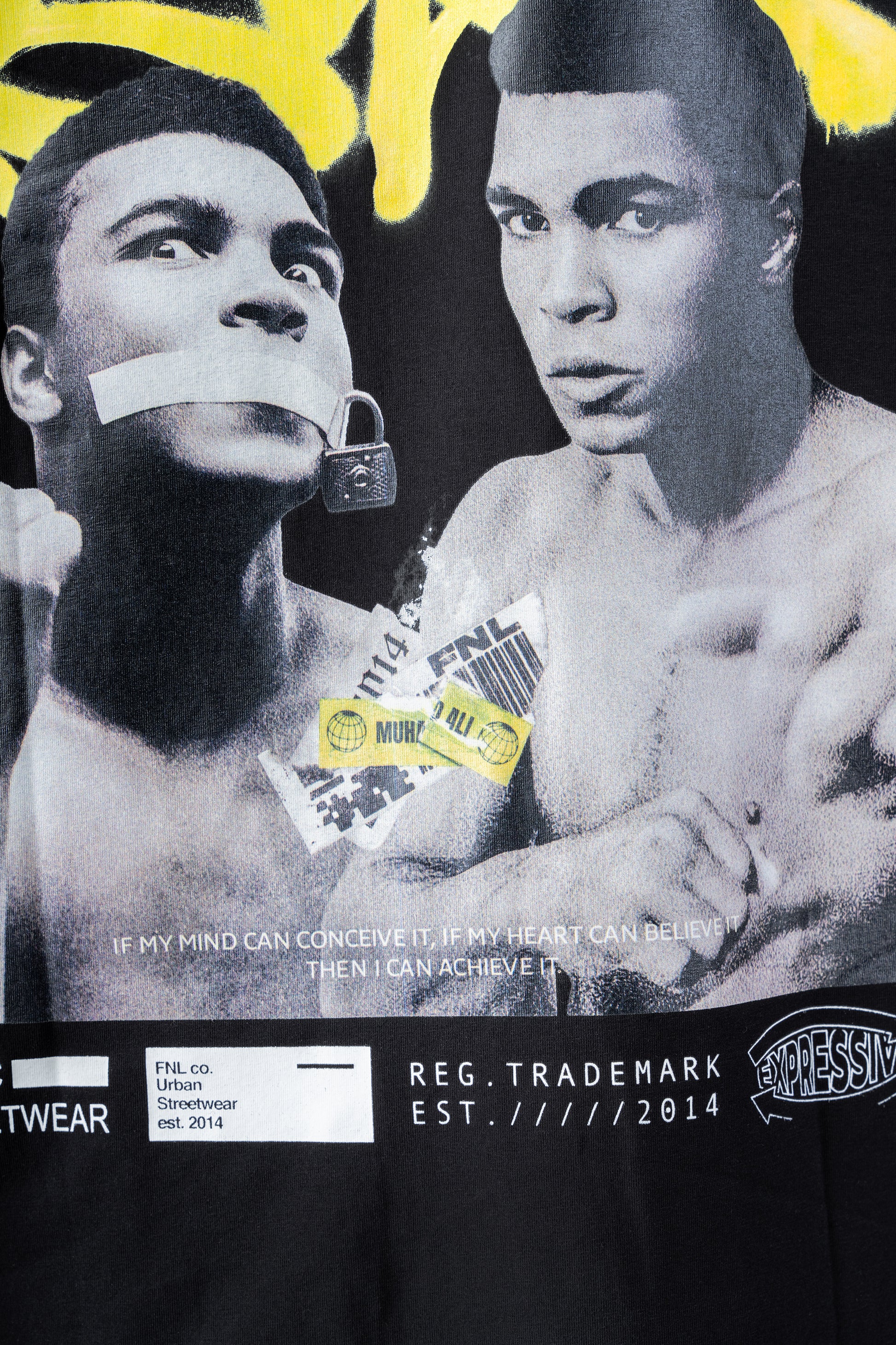في هذا التصميم، يتم تصوير "محمد علي" بخط جرافيتي عريض. على الجانب الخلفي، تظهر الصورة الأيقونية لمحمد علي وفمه مغطى بشريط، مما يمثل ردًا متحديًا على النقاد الذين اتهموه بأنه كثير الكلام. أسفلها توجد عبارة تحفيزية تُنسب لمحمد علي: "إذا كان عقلي يستطيع تصوره، وإذا كان قلبي يستطيع تصديقه، فإنني أستطيع تحقيقه."