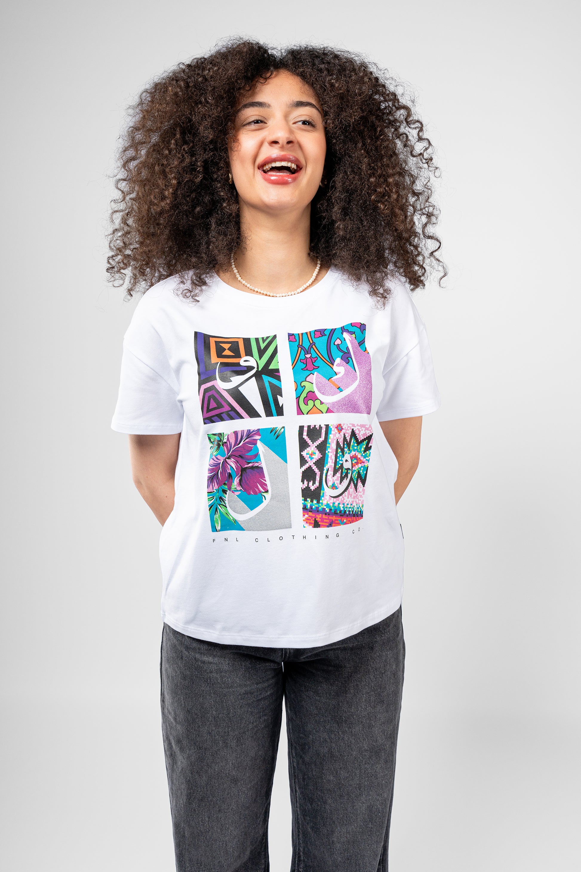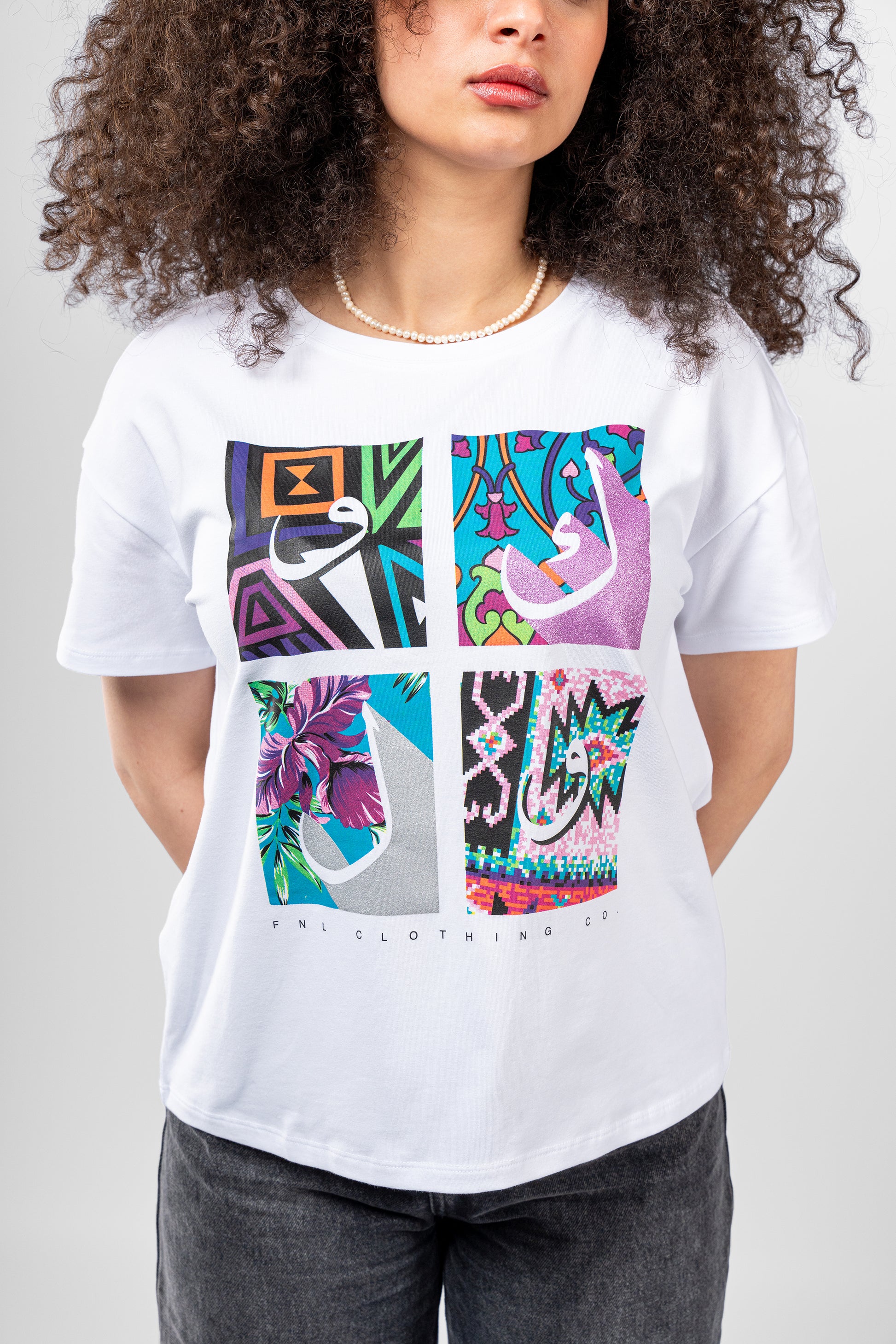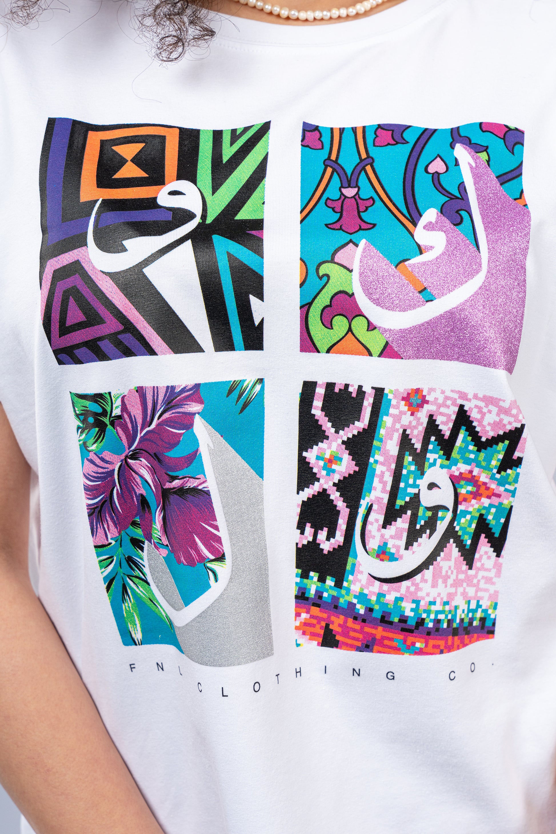 تتميز القميص بكلمة 'cool' مكتوبة بالعربية كـ "كوول" في تصميم فني نابض بالحياة. كل حرف موضوع في زاوية مختلفة من التصميم.