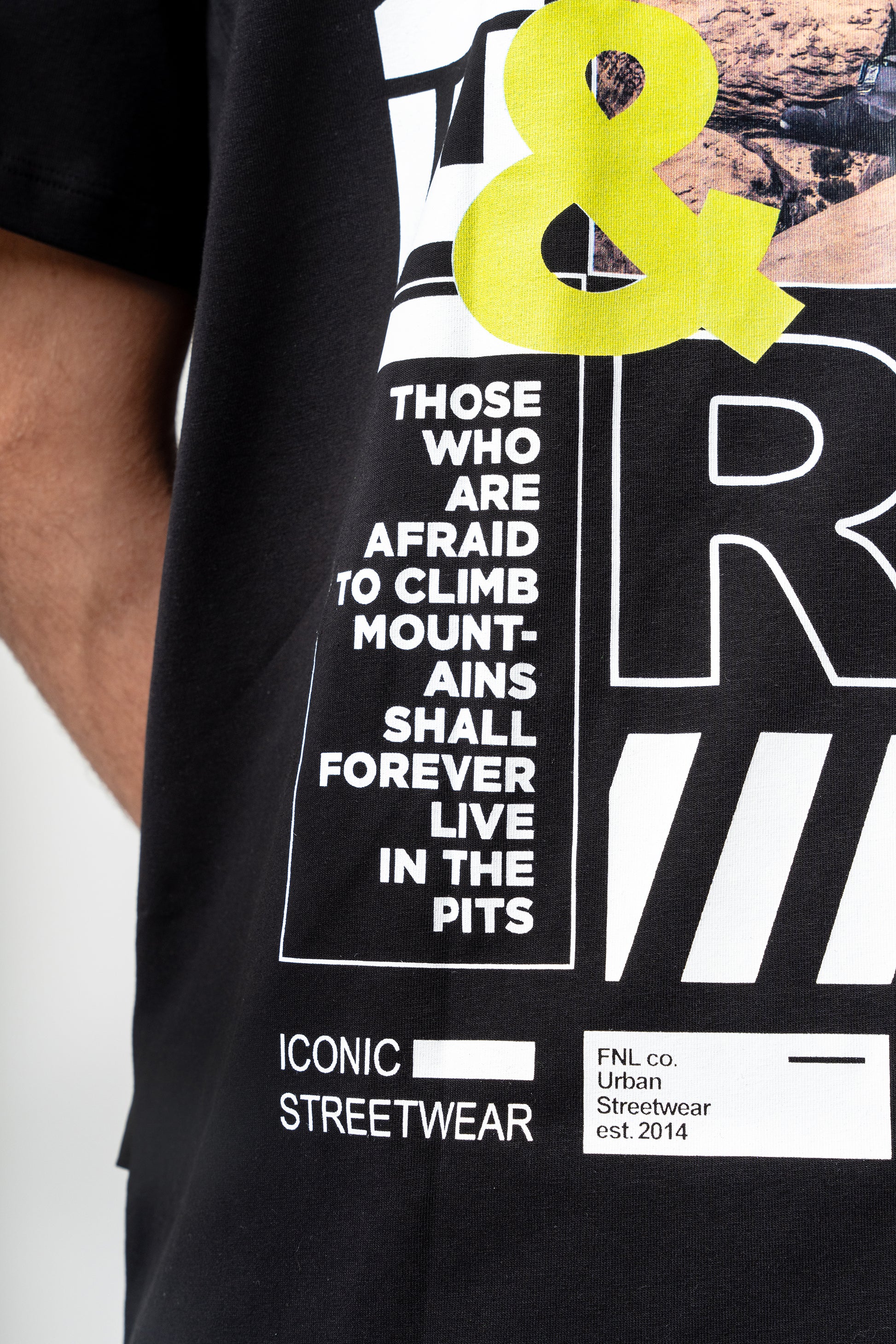 معروض بشكل بارز على كل من الجهة الأمامية والخلفية للتي شيرت هو الرسالة القوية 'تحمل وارتفع'. في الخلف، تصوير جذاب لرجل بدوي يقف بفخر، مصحوبًا بخط عربي فريد مُنسق في تشكيل دائري. يحيط بالتصميم الاقتباس: 'الذين يخافون من تسلق الجبال سيعيشون إلى الأبد في الحفر'.