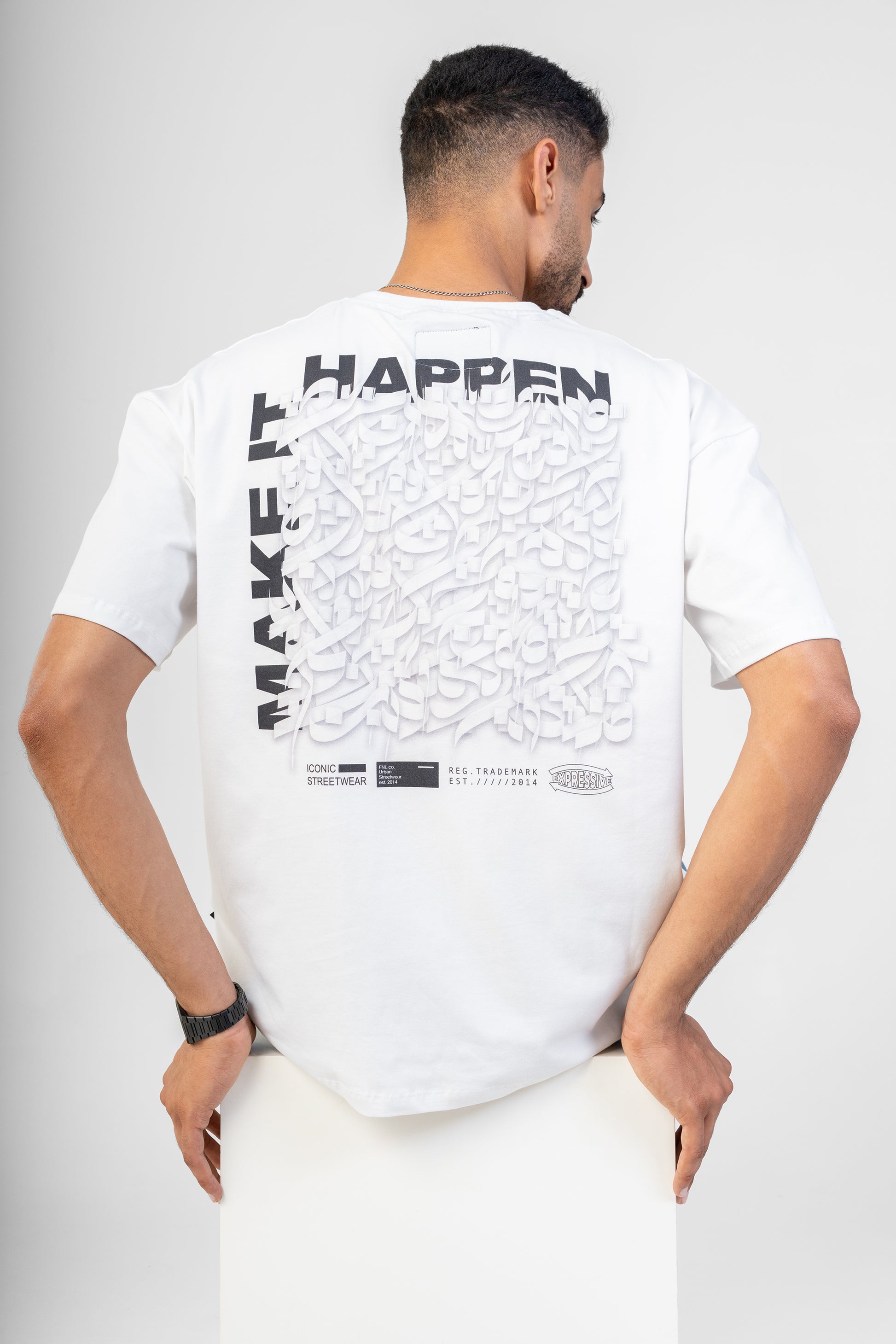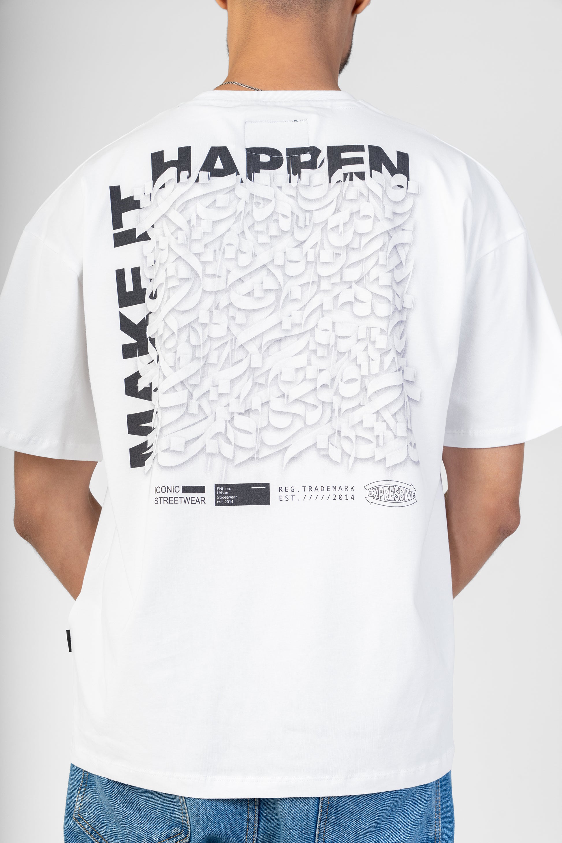 في مقدمة القميص، تم تطريز عبارة "اجعلها تحدث" بشكل أنيق، بينما يظهر في الخلف خط ثلاثي الأبعاد ديناميكي في عرض جذاب.