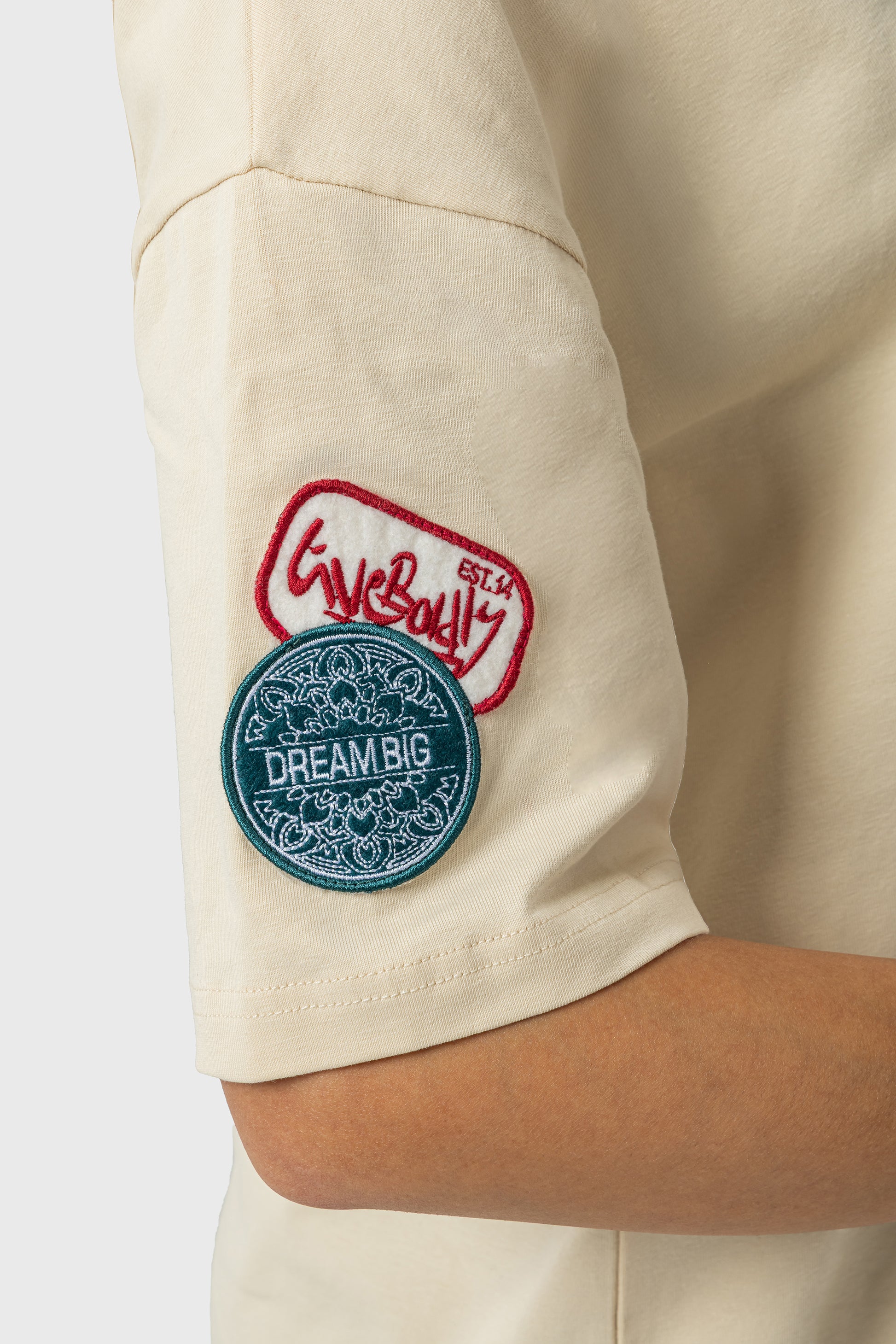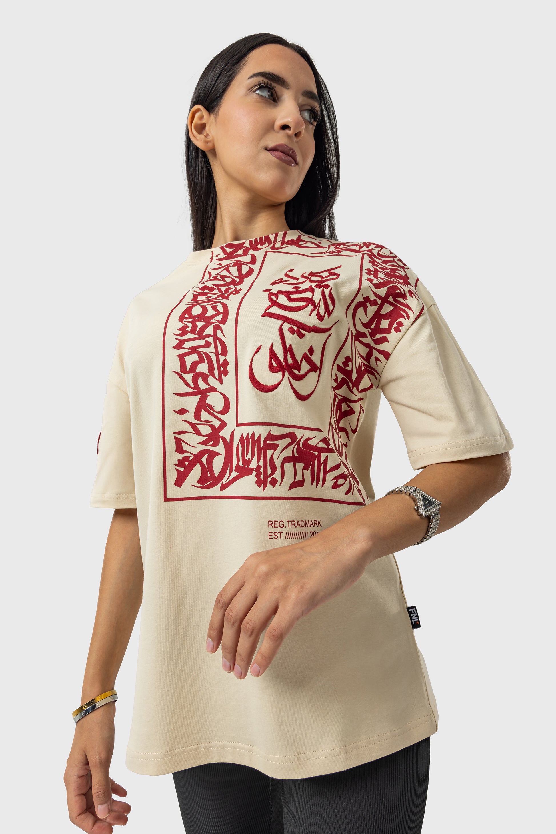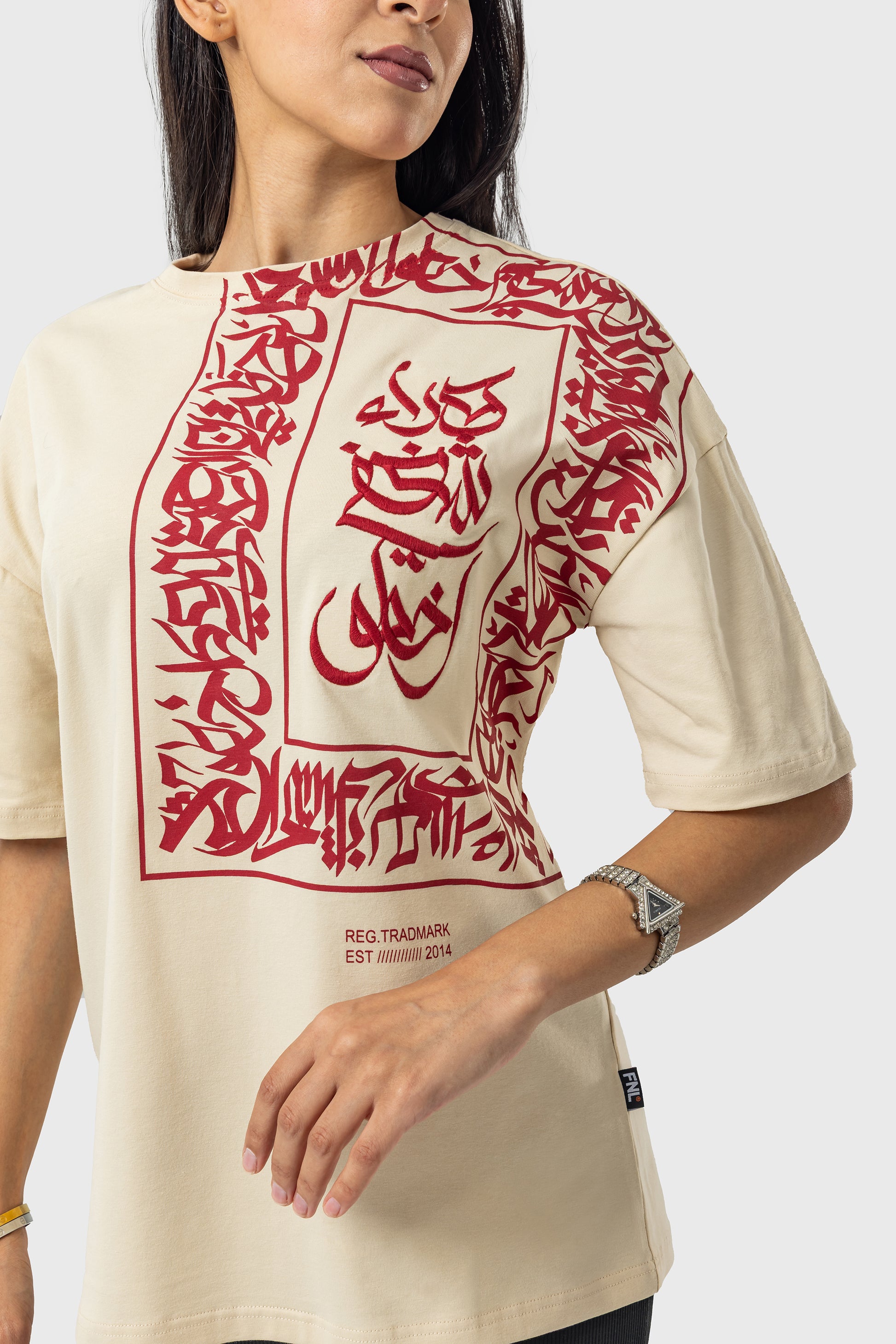 This T-shirt features a striking calligraphic design with the inspiring Arabic phrase "وراء شغفي أخطو" ("I step forward following my passion") framed in a vibrant red border. The bold calligraphy not only serves as a powerful statement of intent but also celebrates the artistry of Arabic script. Accented with a "Dream Big" patch on the sleeve, this tee embodies motivation and cultural pride.