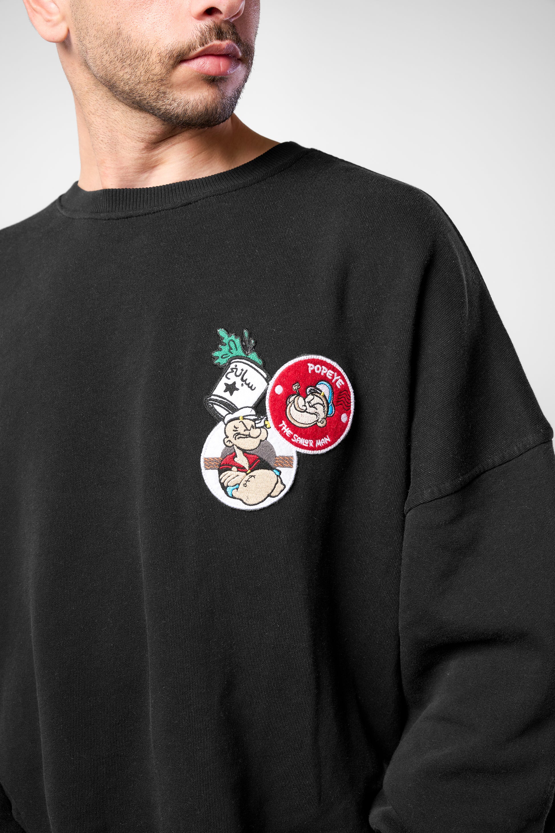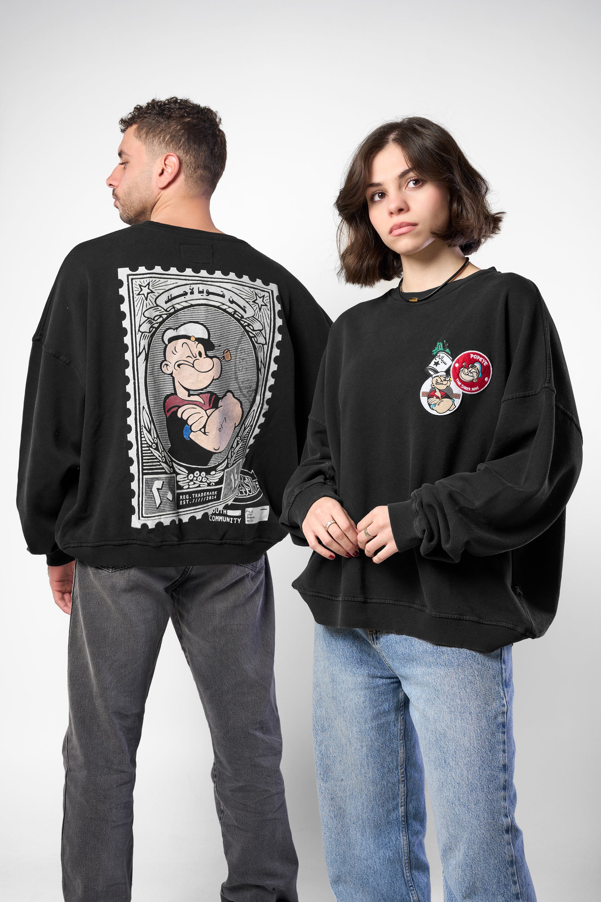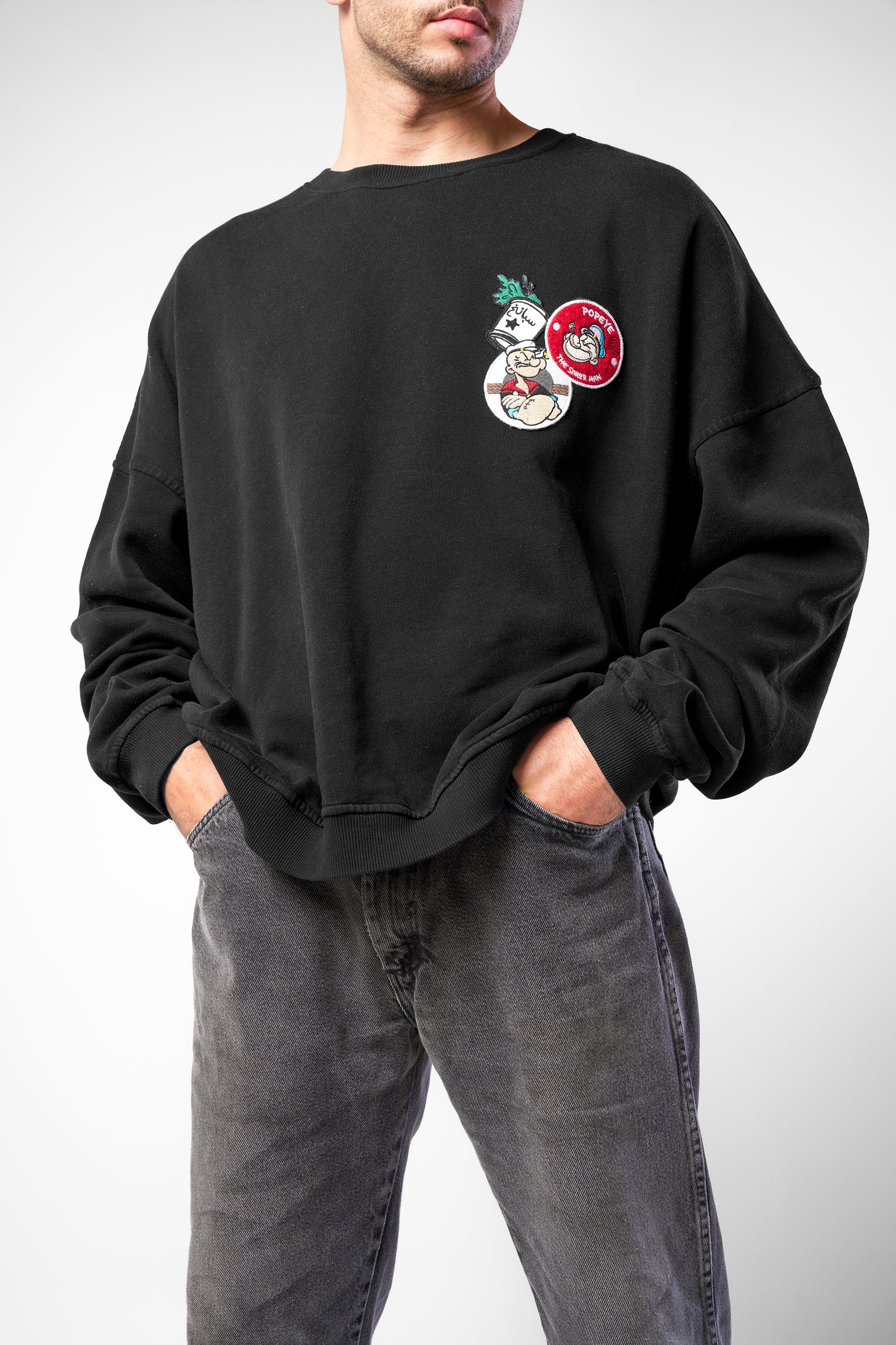 تتميز ظهر السويت شيرت بختم لبوبي بجانب الاقتباس العربي "كن قويًا من أجل نفسك"، مما يعكس القوة. في حين أن الجهة الأمامية تعرض رقعًا مرحة لبوبي وعلبة السبانخ الشهيرة الخاصة به.