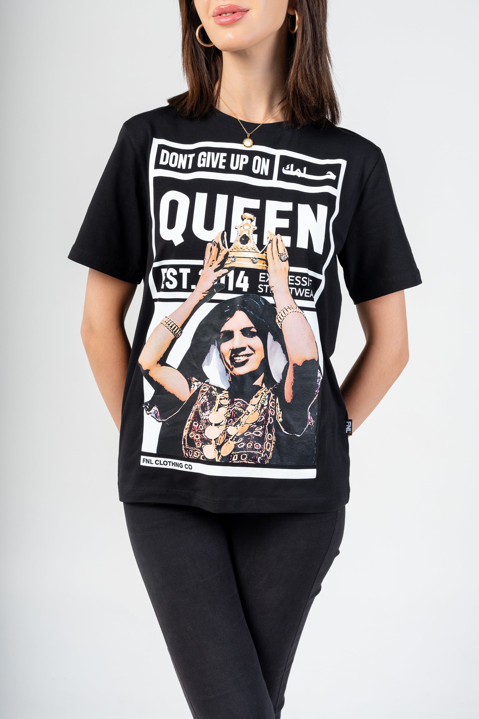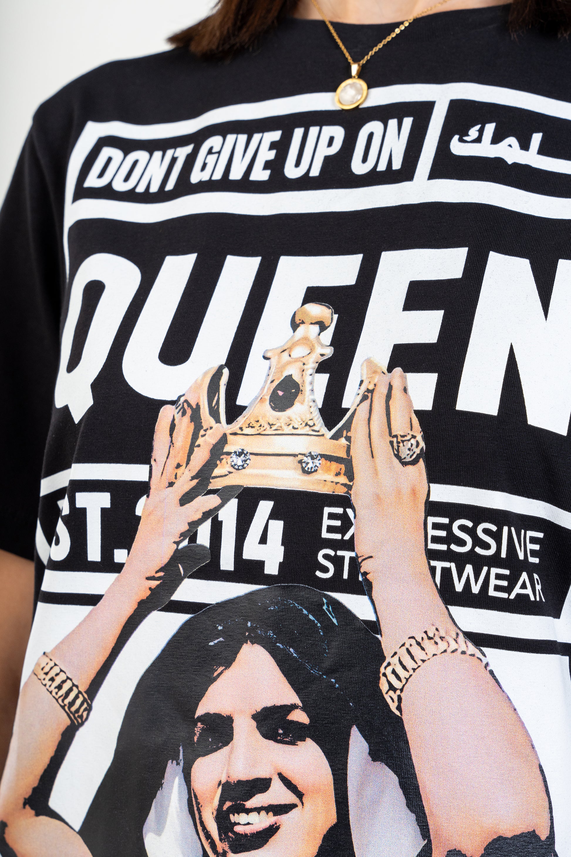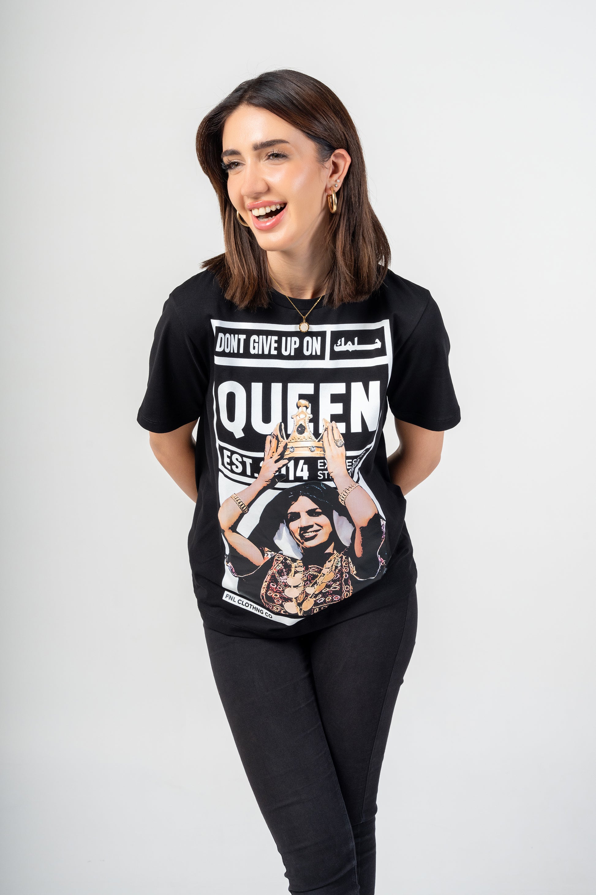 على الجهة الأمامية من القميص، يتم عرض العبارة 'لا تتخلي عن حلمك يا ملكة'، مع كتابة كلمة 'حلم' باللغة العربية. أسفل العبارة، توجد صورة لامرأة بدوية فخورة تحمل تاجًا.