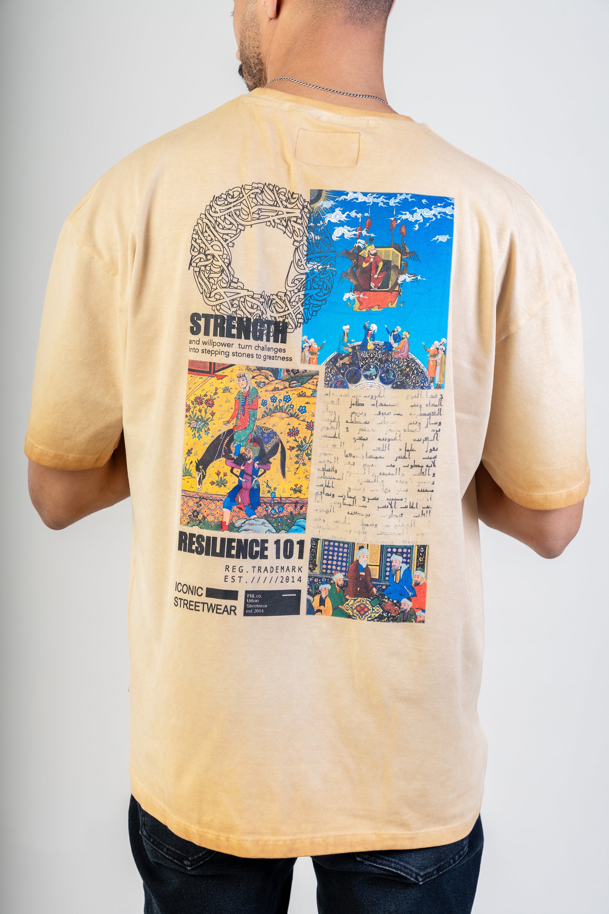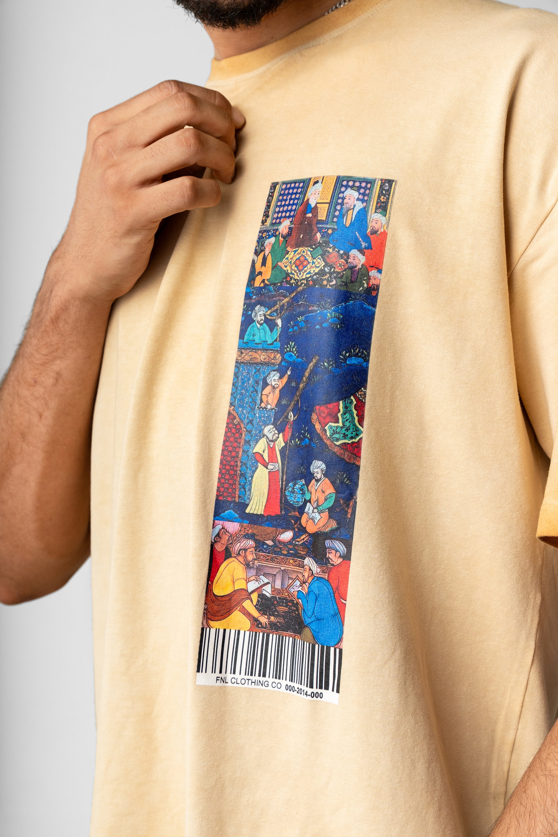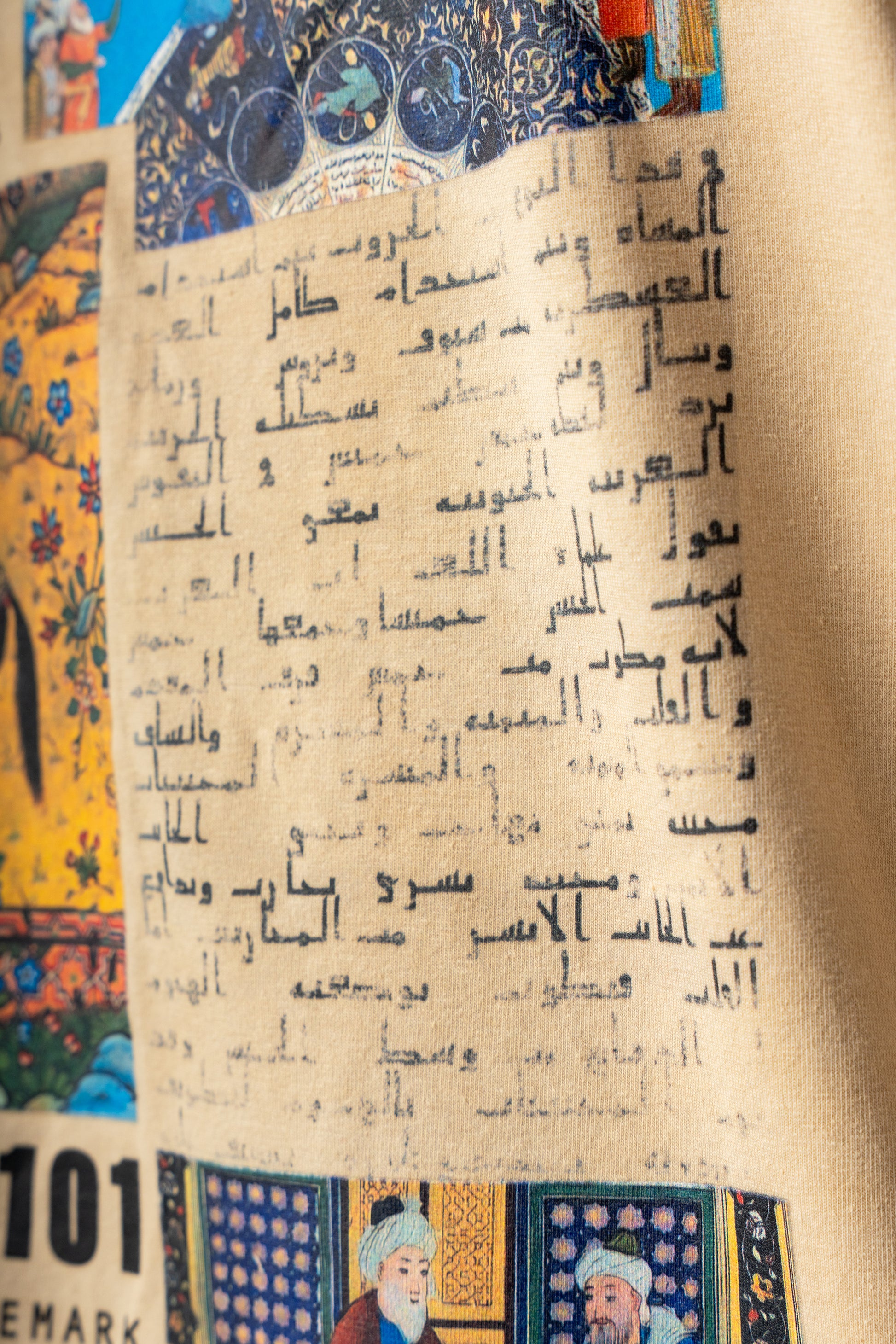 تُطبع لوحات بأسلوب شرقي على ظهر القميص تُظهر مشاهد مليئة بالتراث والثقافة. وسط هذه اللوحات، تُظهر نصوص عربية قديمة تبادل رسائل بين جيشين، مما يضيف لمسة تاريخية. في الأعلى، يُعزز تصميم دائري جذاب من الخط العربي الجمالية. على الجهة الأمامية من القميص، تُعرض مجموعة من هذه اللوحات بشكل أنيق، مما يُبرز التصميم بشكل أكبر.