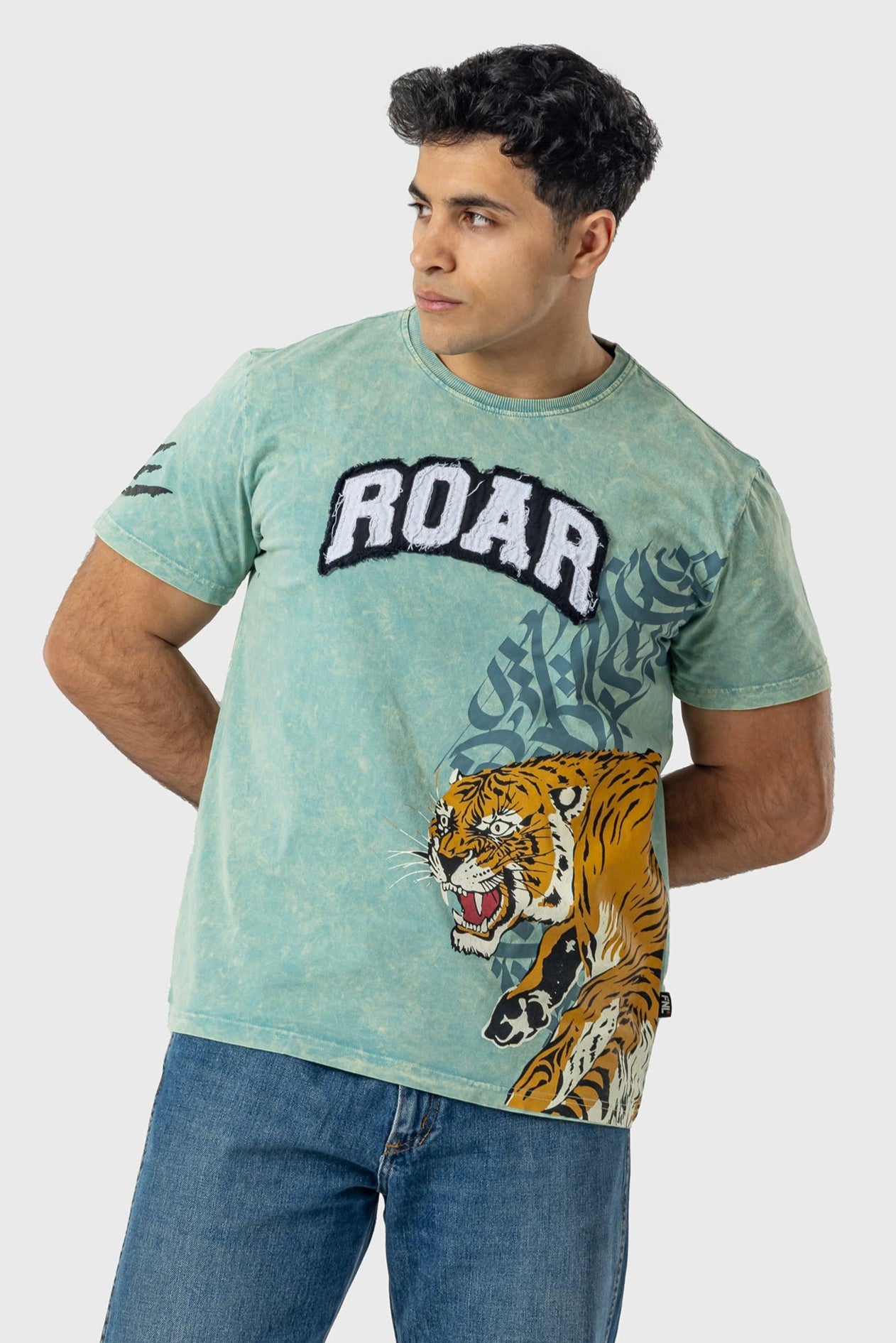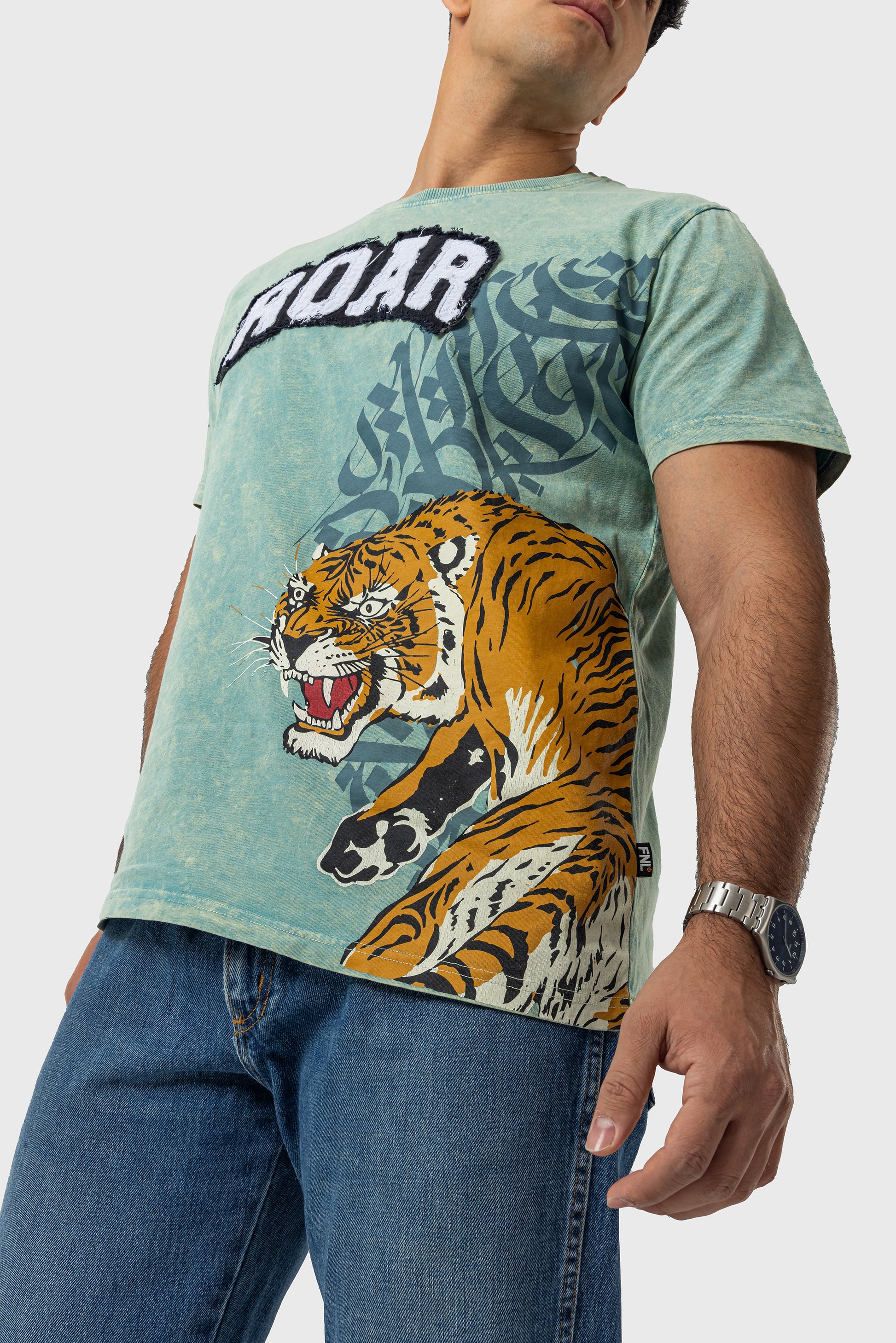 Unleash your inner strength with the "Roar Tee," a fierce fusion of power, art, and street culture. Dominated by a striking tiger graphic symbolizing courage and intensity, this design is elevated by a dynamic circle of abstract Arabic calligraphy, adding an edgy, culturally rich vibe. Above it, the bold typography of the word "ROAR" confidently announces your presence.
