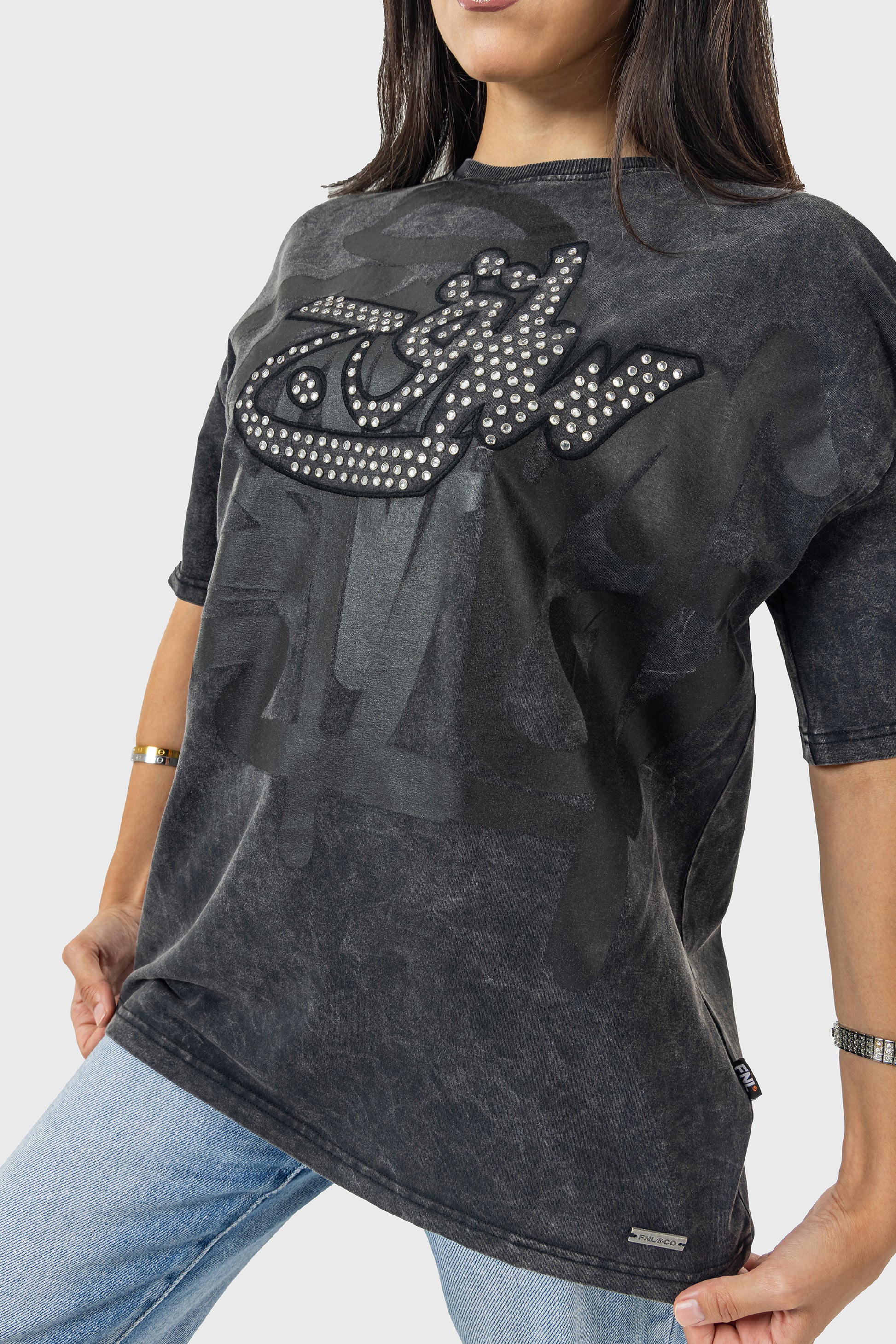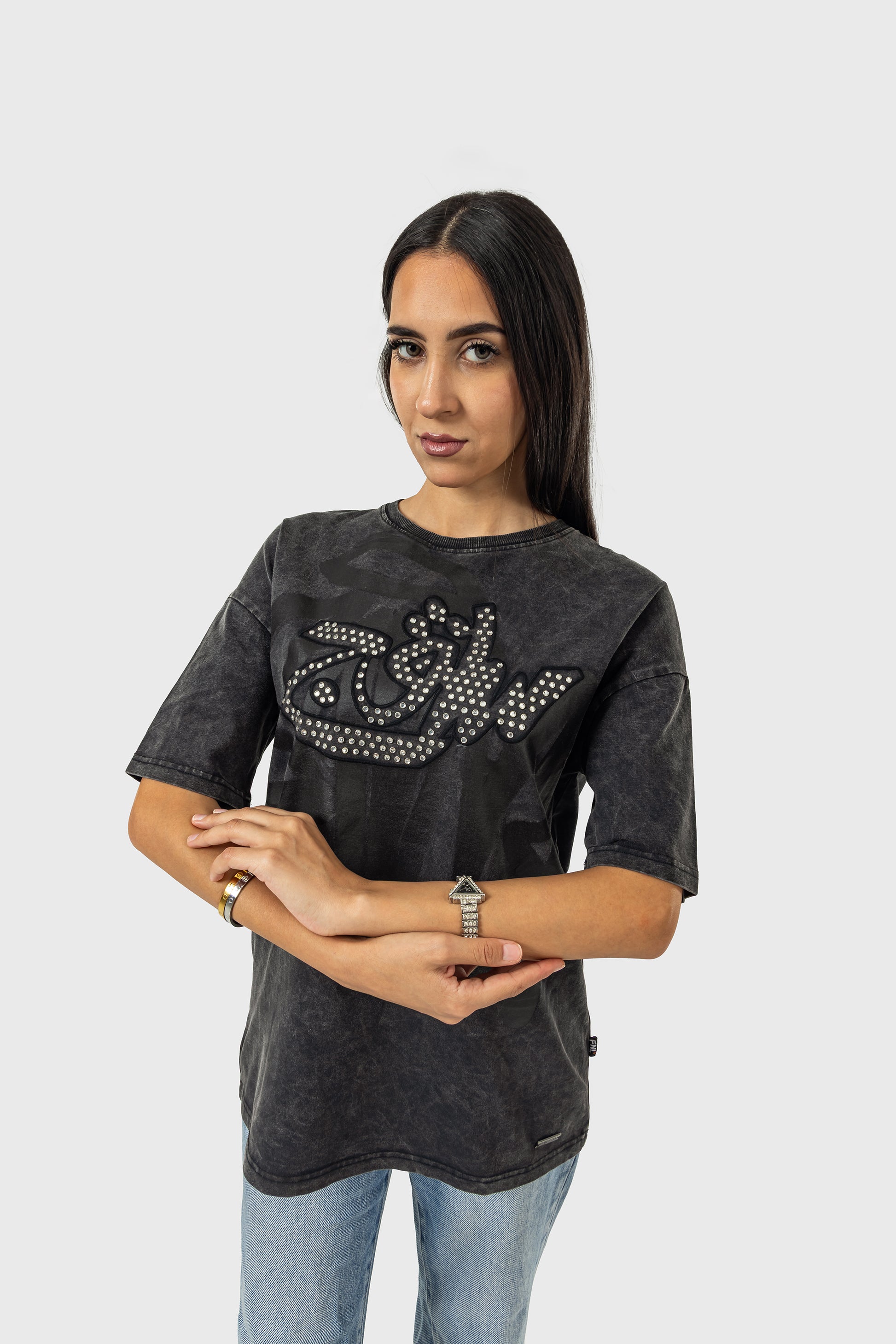 A fierce fusion of edgy street aesthetics and chic glamour. The striking design showcases the word "Savage" boldly scripted in expressive English graffiti-style lettering, layered beautifully beneath shimmering Arabic typography crafted with sleek black rhinestones.
