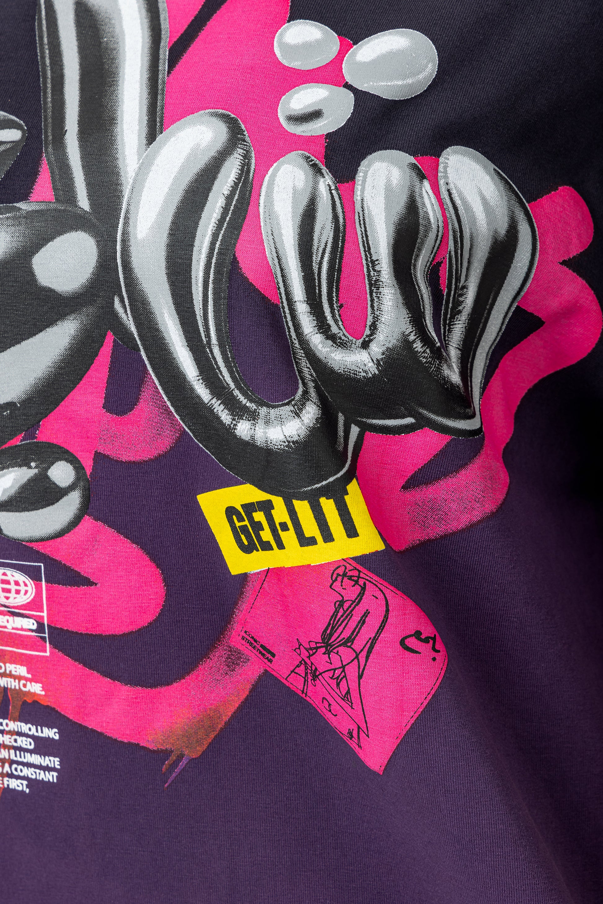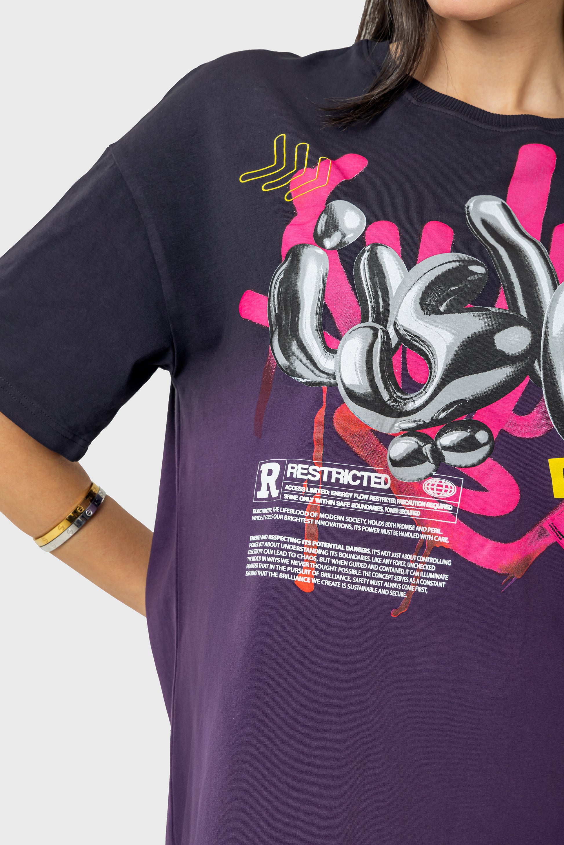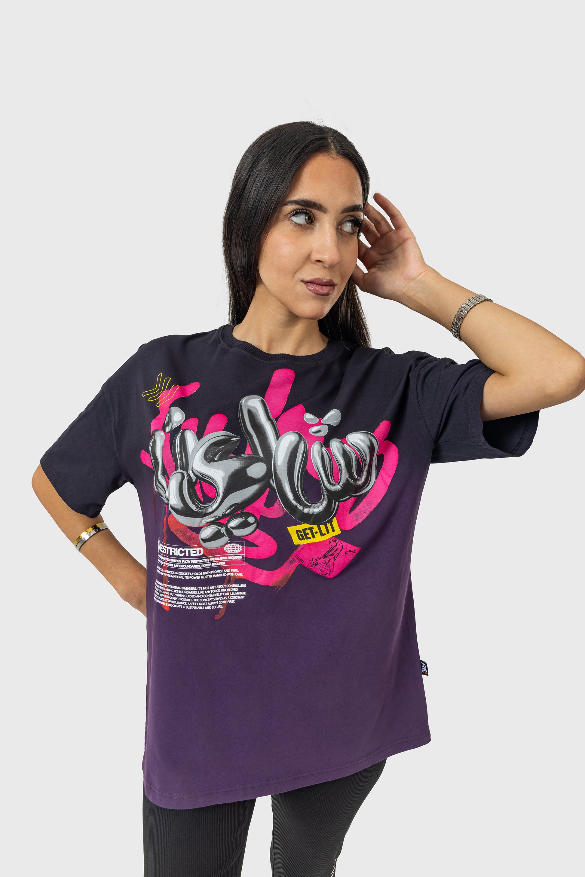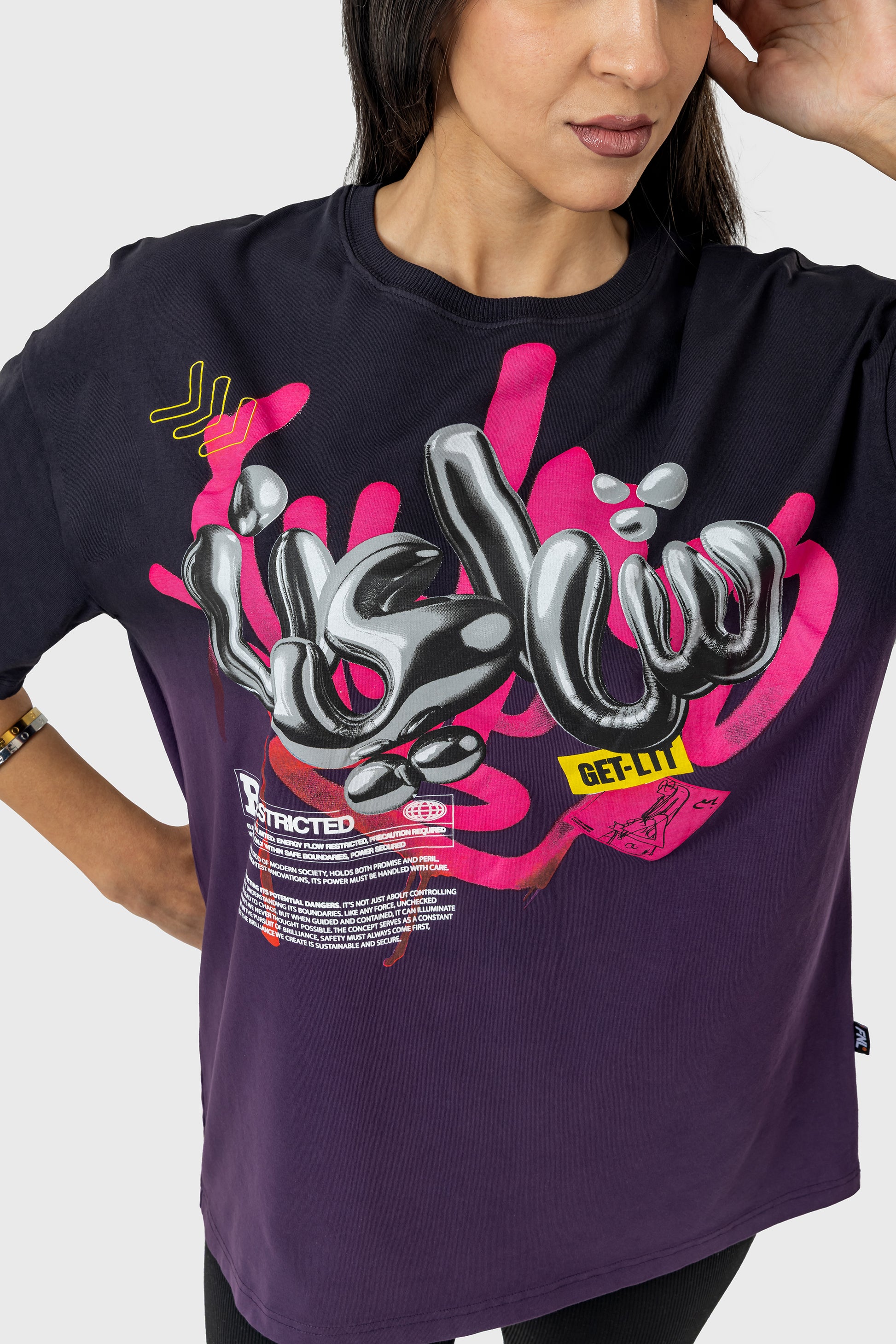 featuring a playful, urban take on the Arabic word "Shine" (شايِن). Rendered in captivating metallic typography against vibrant street-style graphics, this design blends youthful energy with contemporary fashion. Each metallic stroke reflects confidence, creativity, and charisma, inviting you to embrace your inner glow.