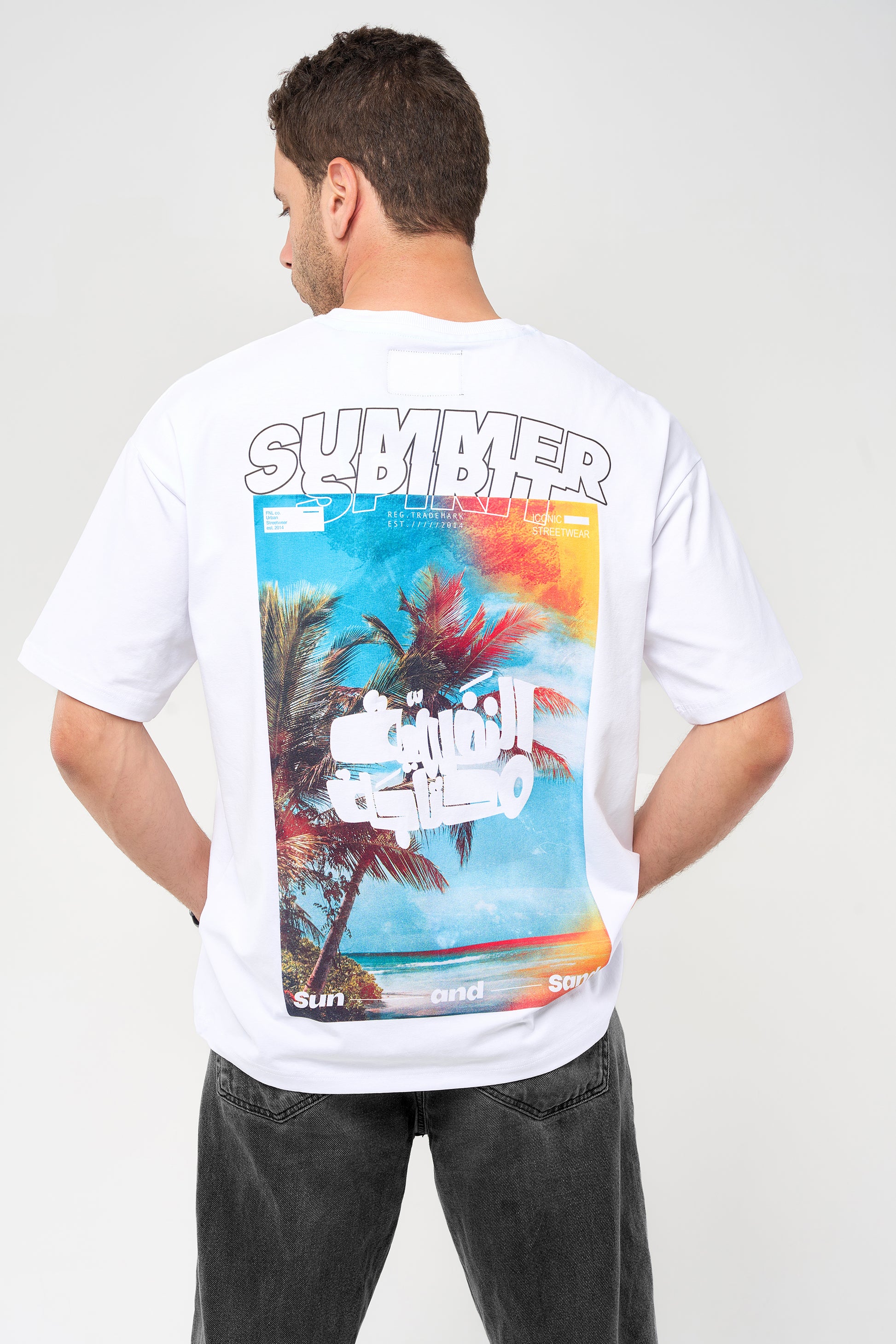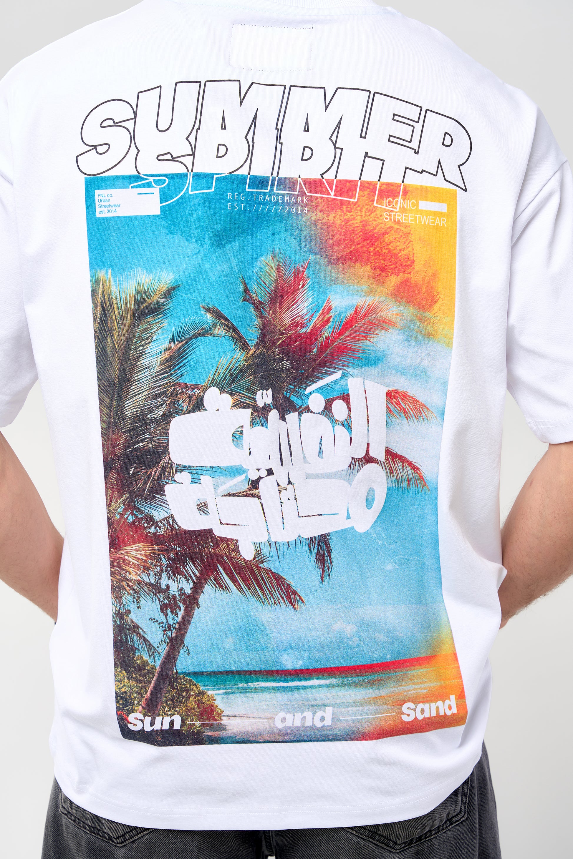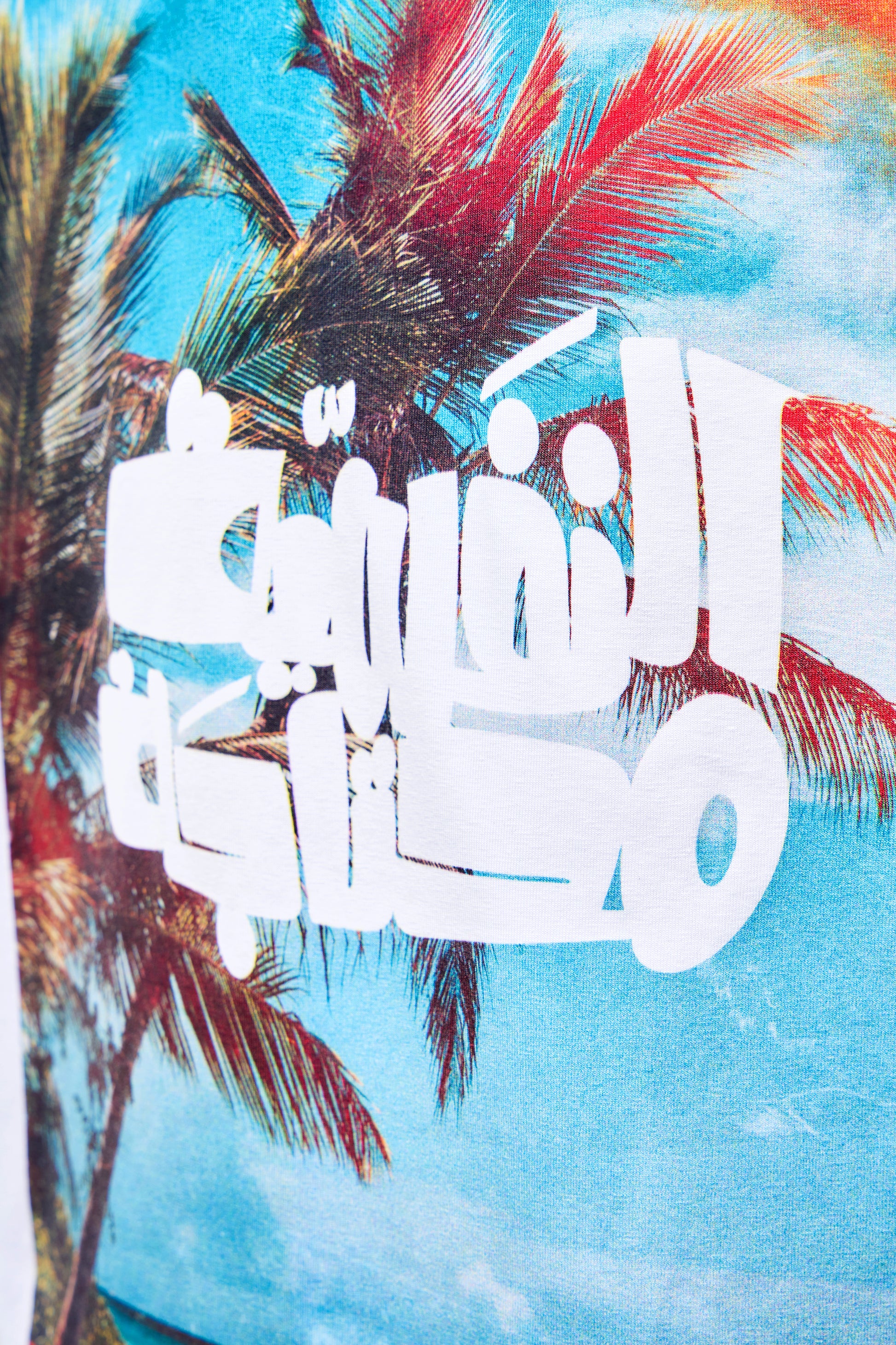 This design screams summer vibes! The back features the phrase "sun and sand النفسية محتاجة," meaning “the mood needs some sun and sand” a reminder that a little beach therapy goes a long way. The front includes a pocket, adding a cool, casual touch to this sunny mood lifter.