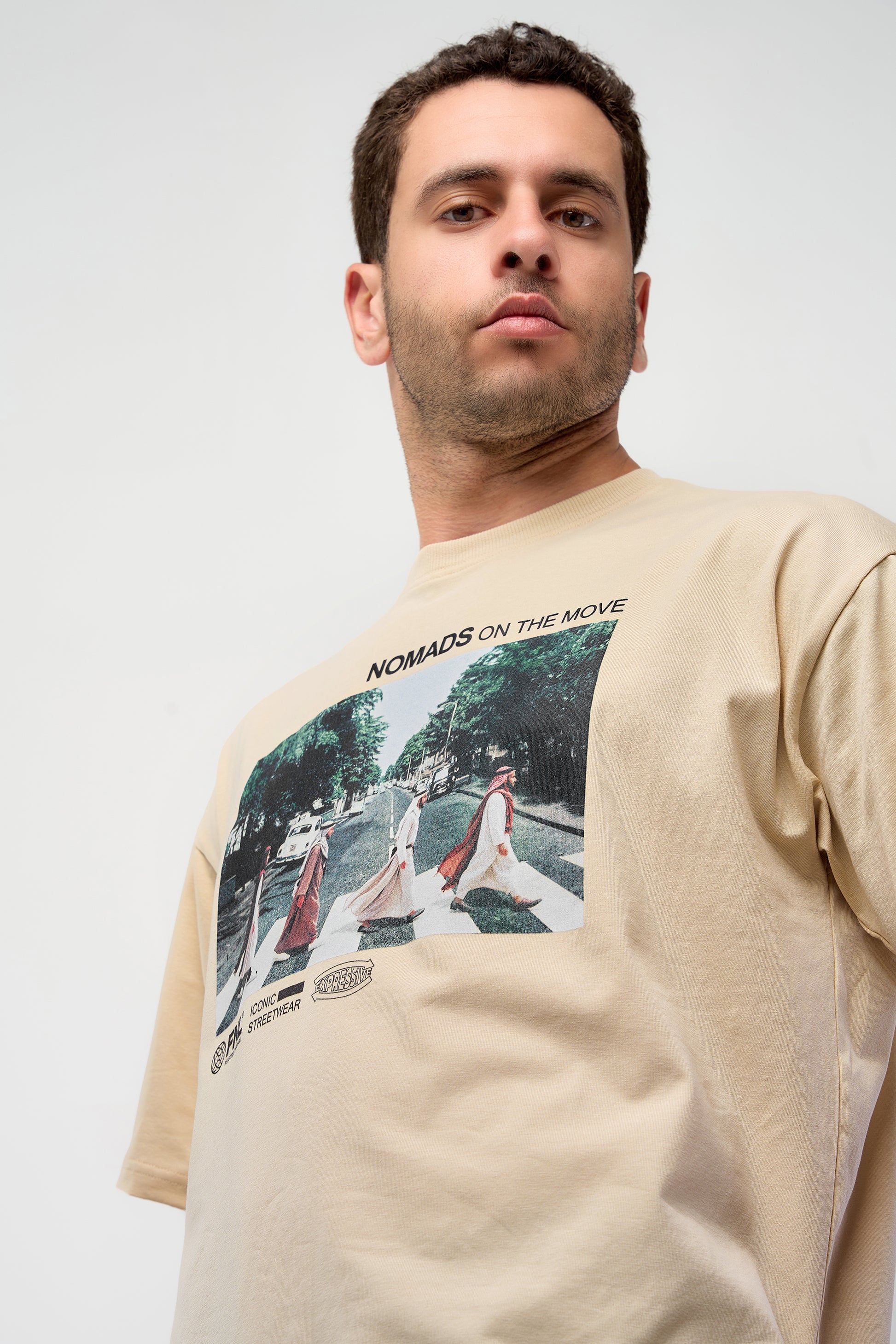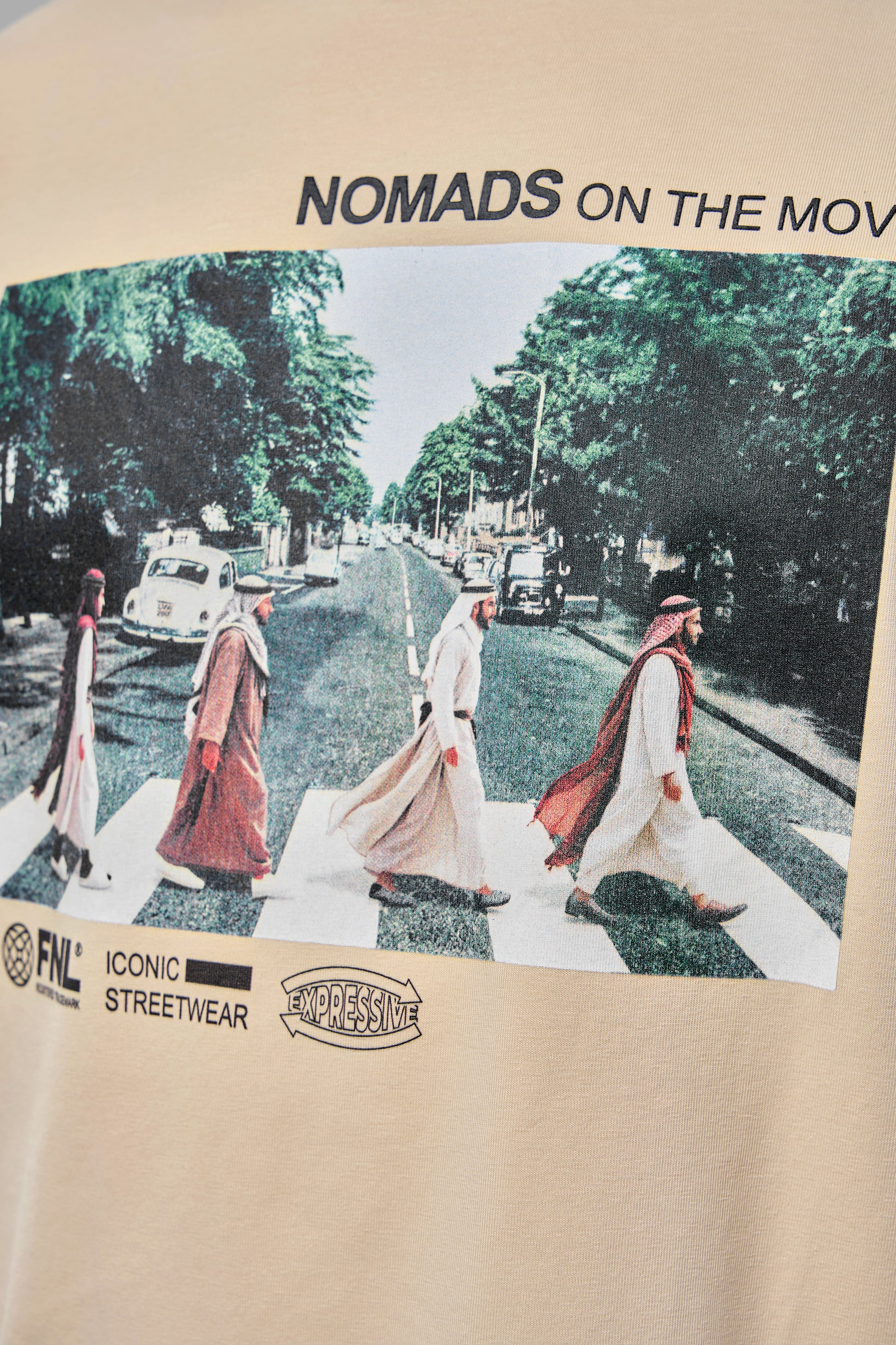 The T-shirt design reimagines the iconic Beatles' Abbey Road crossing, giving it a unique Bedouin twist. Instead of the Beatles, the scene features Bedouins in traditional outfits, seamlessly blending cultural heritage with an artistic homage to a timeless classic.