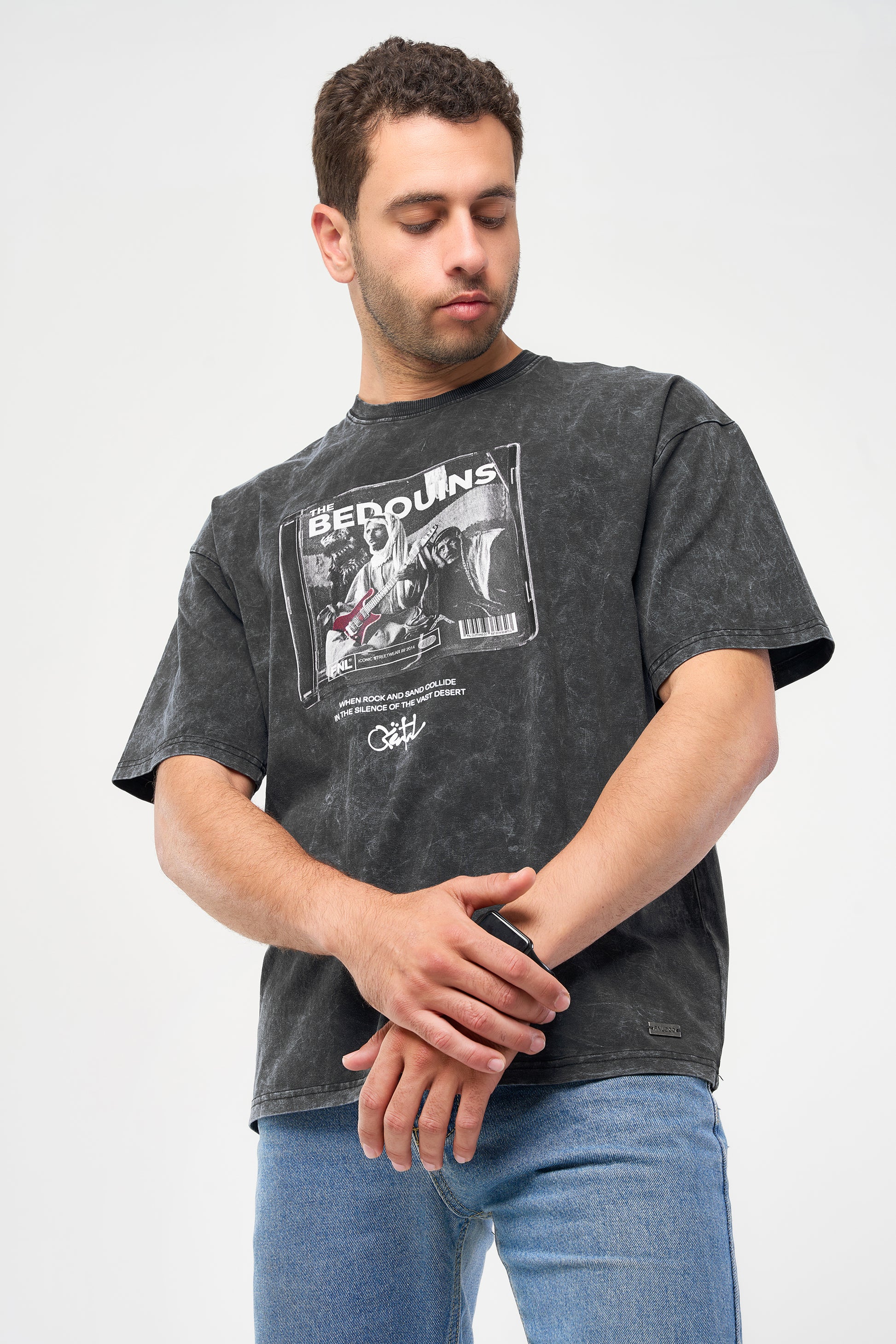 The design showcases a striking album cover-inspired artwork, featuring two Bedouins as the band members. The visual evokes the look of a classic CD music cover, complete with the band's name, The Bedouins. This fusion of traditional Bedouin imagery with modern music culture creates a bold and unique statement piece.