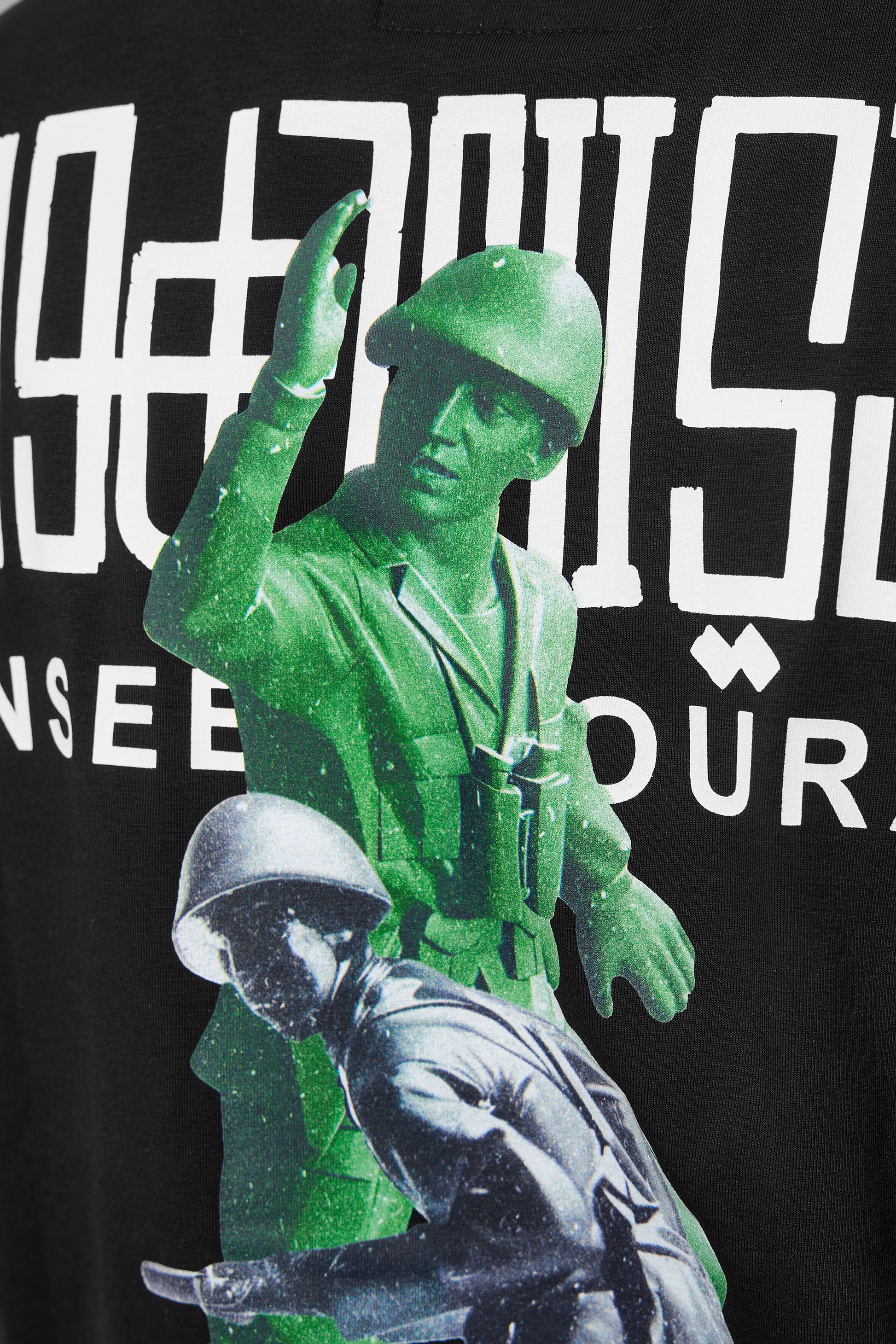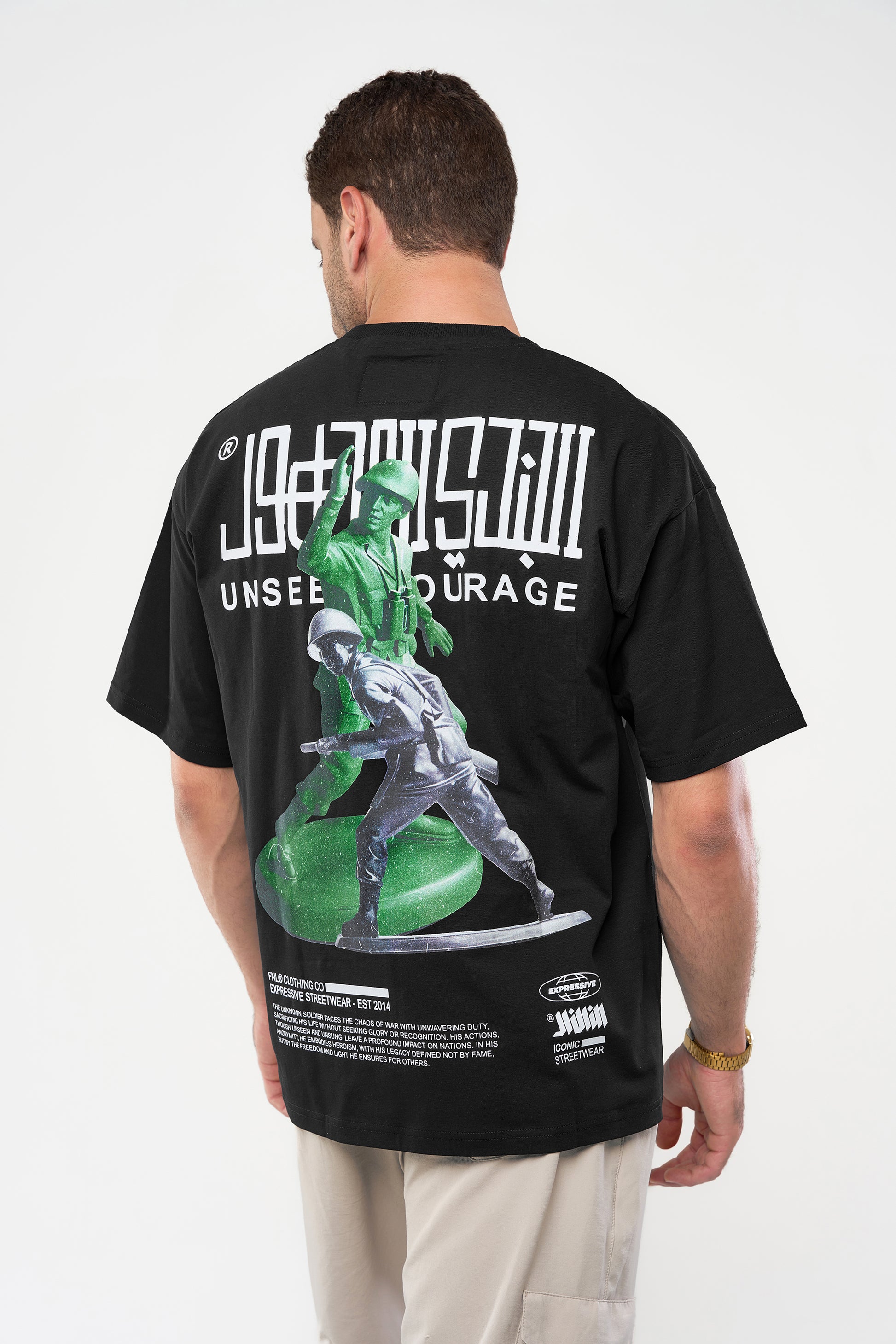 This design pays homage to the “الجندي المجهول” (The Unknown Soldier) with a bold statement on the front. On the back, the phrase gets a playful twist with vintage soldier toys, adding a fun, nostalgic edge to this tribute.