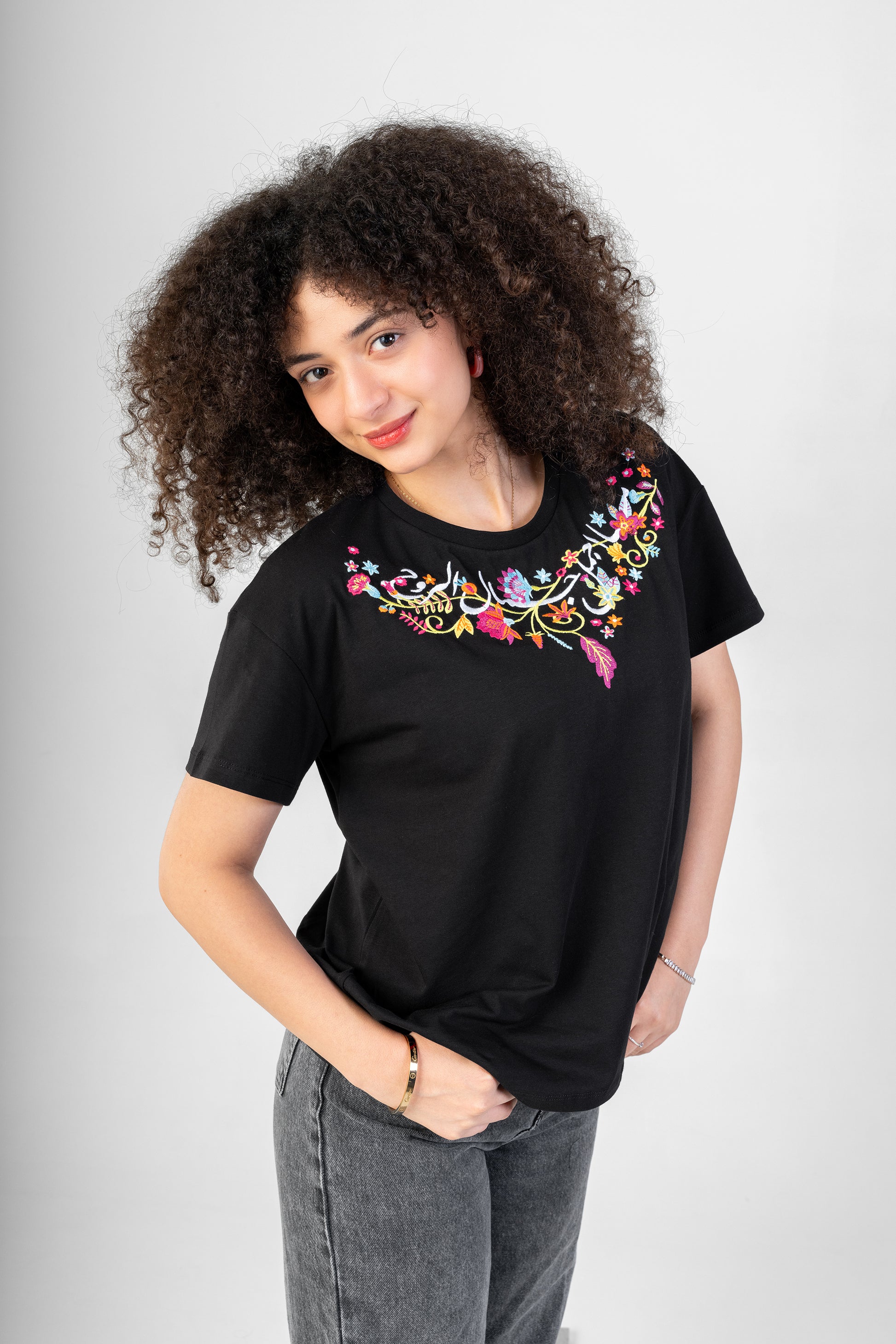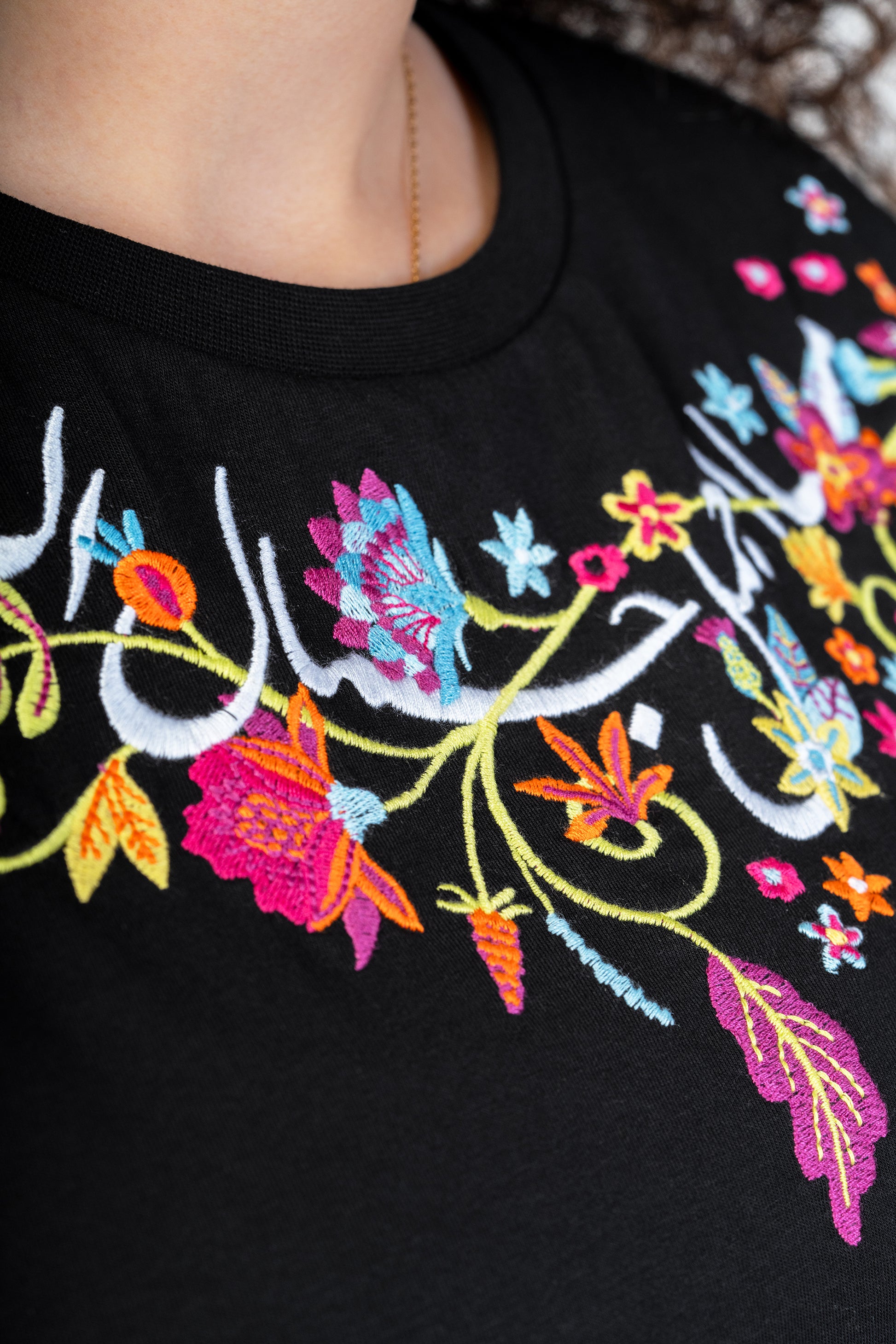 The shirt design has an Arabic quote 3D embroidered that reads "How beautiful the soul is.".